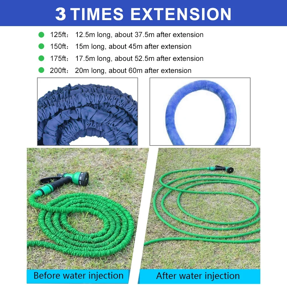 Этот водяной шланг имеет расширяемый дизайн, который позволяет ему продлить в 3 раза первоначальную длину, когда давление воды включено. Поставляется с распылителем, который предлагает 7 моделей распыления, приносит много удовольствия при поливе. Легкий и прочный, отлично подходит для мытья автомобиля, уборки пола, полива сада и многого другого.