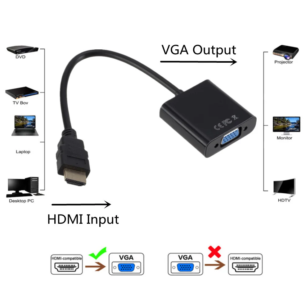 Характеристика: 1. Этот продукт предназначен только для HDMI-совместимого одиночного (ноутбука) к VGA одиночного (монитора) пути передачи. 2. Если ваше устройство PS4, ТВ-приставка, проектор, выберите питание и аудио кабели, так как эти устройства требуют дополнительной мощности. Характеристика: Поддерживает разрешение до 1080P (1080p Full HD), включая 480P/ 576P / 720P для HD мониторов или проекторов Подходит для всех устройств, совместимых с HDMI входом и VGA выходным интерфейсом Встроенный чип преобразования улучшает Совместимость Конструкция Plug and Play, без специальной настройки Характеристики: Название товара: HDMI-Совместимость с адаптером VGA Нет звука без питания Вход: HDMI-совместимый тип A Выход: VGA Женский Цвет: черный/белый Максимальное разрешение: 1080P Материал: Поликарбонат Посылка 1 х HDMI-совместимый с VGA адаптером
