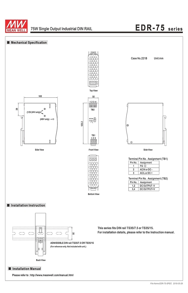 Бренд: Mean Well Модель: EDR-75Series Напряжение постоянного тока: 24 В Номинальная мощность: 75 Вт