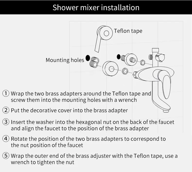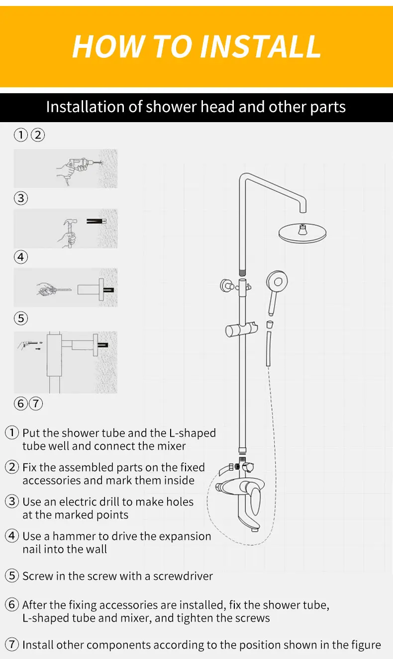 6. После установки крепежных Аксессуаров, закрепите трубу для душа, l-образную трубку и миксер,