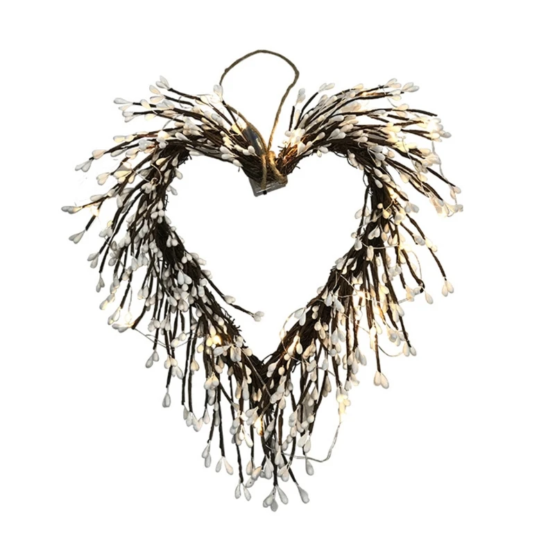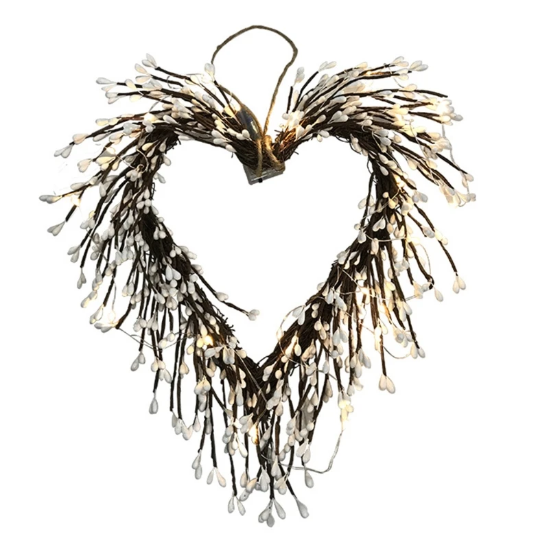【Светящийся венок в форме сердца с красной ягодой 】 венок на День святого Валентина предварительно освещен 20 красными светодиодными лампами и отделан белыми ягодами и белыми семенами. Принося символ энергии и жизнестойкости для вашей передней двери.
