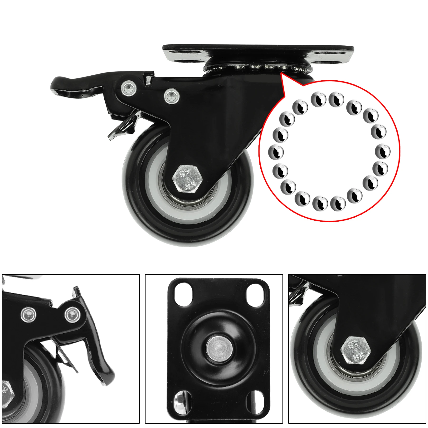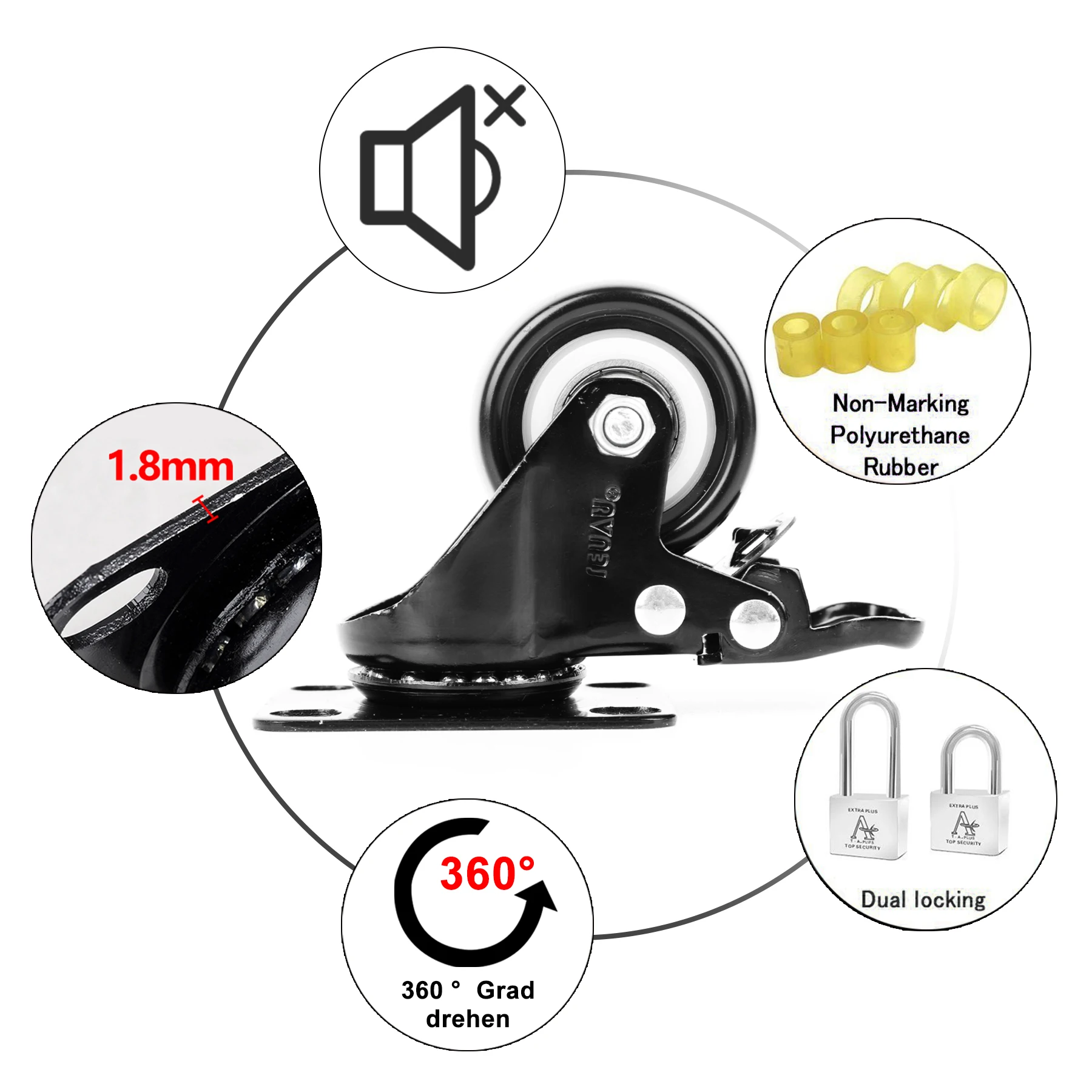 Сверхпрочная конструкция: Наши 50 мм ролики с защитными тормозами изготовлены из прочной стали. Прочная конструкция износостойкая и имеет общую грузоподъемность 300 кг, так что она используется для практически любого предмета мебели. Сверхмощные ролики также являются грязеотталкивающими и коррозионно-стойкими