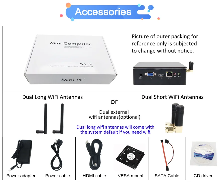 3.Мини-ПК Barebone(Без RAM SSD без WIFI "комплект) посылка.Не включает RAM SSD HDD и WiFi (антенны), Если вам нужен WIFI, пожалуйста, доплатите 6 долларов СШАЭта ссылка.Другие пряди включают Wi-Fi (антенны).