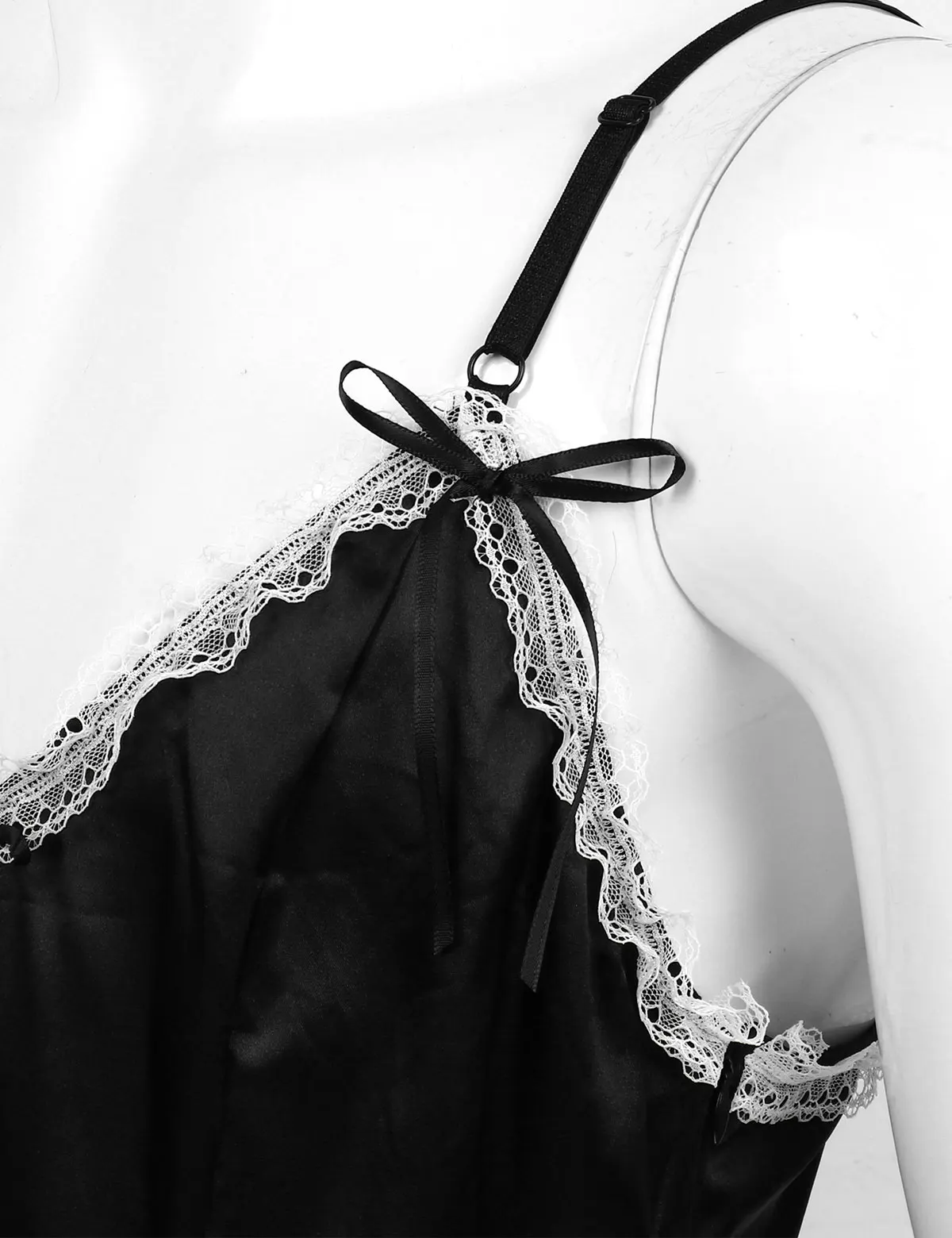 Регулируемые бретельки на бретельках, v-образный вырез и низкая спинка, с оборками и кружевной каймой.