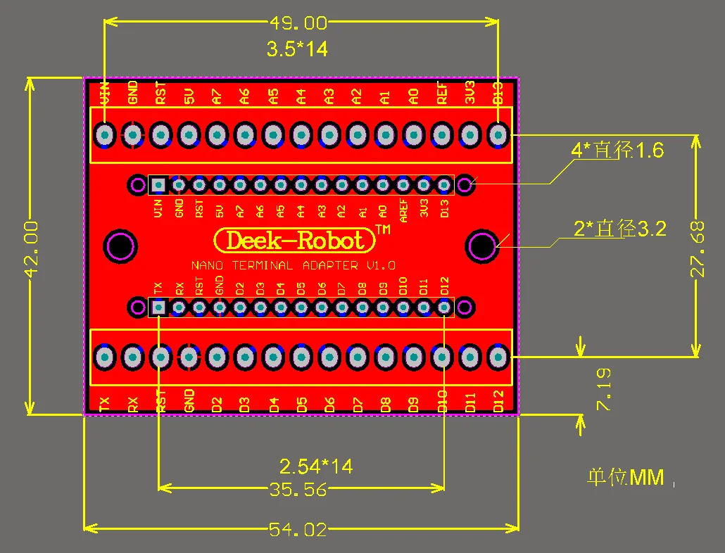 Это клеммный адаптер для Arduino Nano. Он подходит для Arduino Nano версии 3,0, однако вы все еще можете использовать этот адаптер для более старой версии (Просто помните, что A0-A7 находятся в обратном порядке). Вы можете использовать этот адаптер, чтобы легко подключить Arduino Nano к внешнему миру с помощью подключенных проводов.