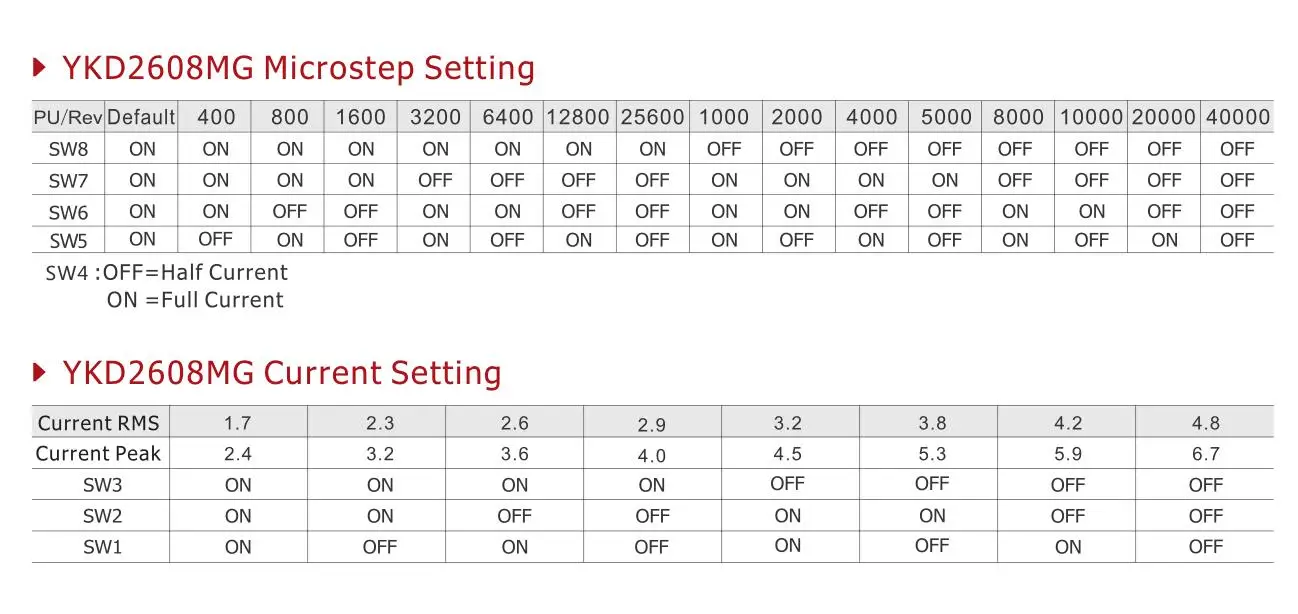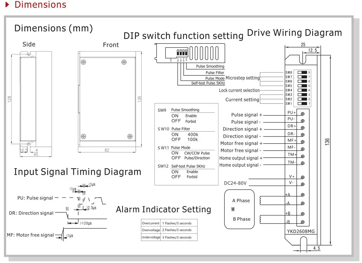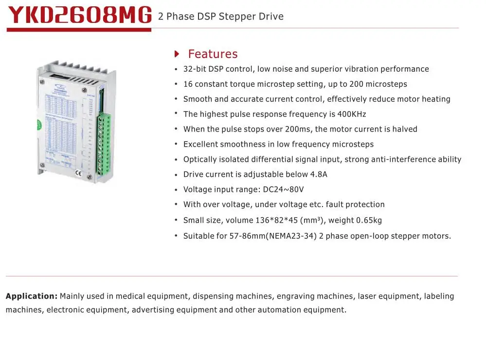 32-битный контрольная DSP, низким уровнем шума и вибрации 16 Настройка микрошага с постоянным крутящим моментом, до 200 микрошагов Плавный и точный контроль тока, эффективно уменьшает нагрев двигателя Максимальная частота отклика пульса составляет 400 кГц Когда пульс останавливается более 200 мс, ток двигателя уменьшается наполовину Отличная гладкость в низкочастотных микроступенях Оптически изолированный дифференциальный входной сигнал, сильная способность анти-помех Ток привода регулируется ниже 4.8A Диапазон входного напряжения: DC24 ~ 80 в Защита от перенапряжения, перенапряжения и т. д. Малый размер, объем 136*82*45 (мм³), Вес 0,65 кг Подходит для 57-86 мм (NEMA23-34) 2 Фаза открытую петлю шаговые двигатели.