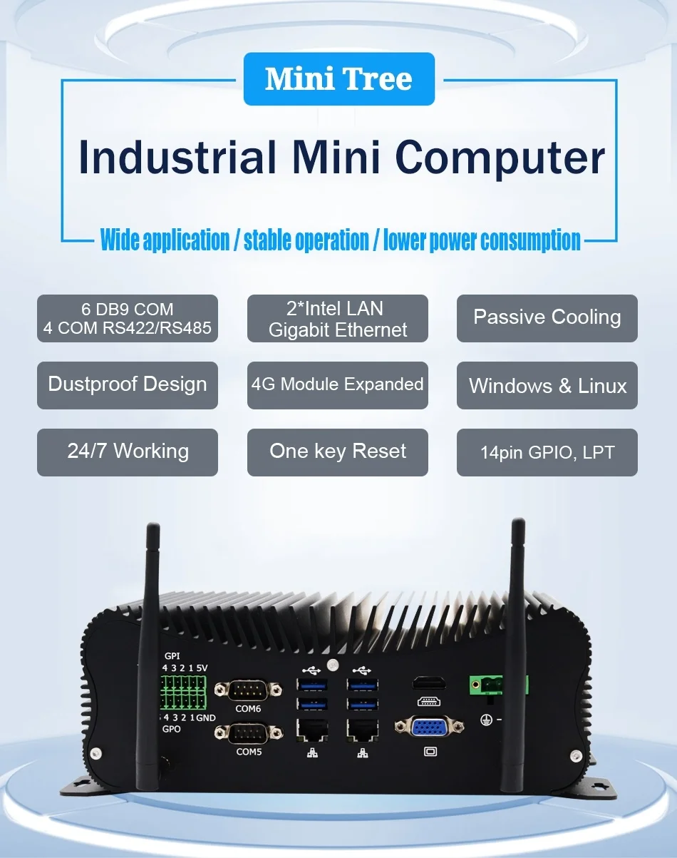 -2xintel i201/i211 Gigabit RJ45 локальных сетей, 6xDB9 COM(4xRS23 2/422/485), 6xusb, PS/2, GPIO и LPTБогатые порты для различного оборудования.