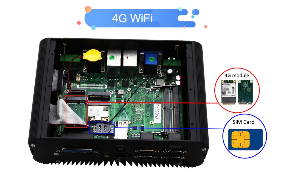 Mini-PCIe x 1 полный размер высоты, 1x слот для sim-карты, Поддержка модуля 3G/4G, Wi-Fi bluetooth