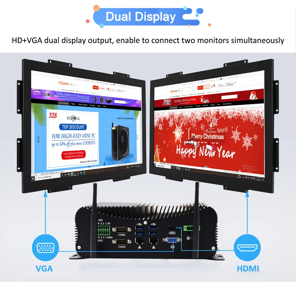 -Синхронно поддерживает двойной дисплей VGA + HDMI.