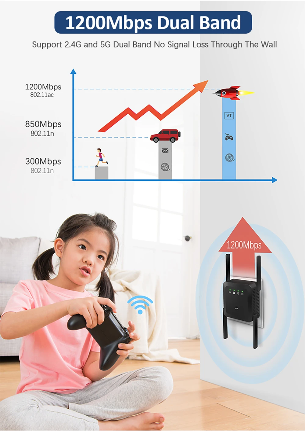 2: двухдиапазонный 1200 Мбит/с, поддержка 2,4G и 5G двухдиапазонный без потери сигнала через стену, сильный сигнал легко проникает в стены,