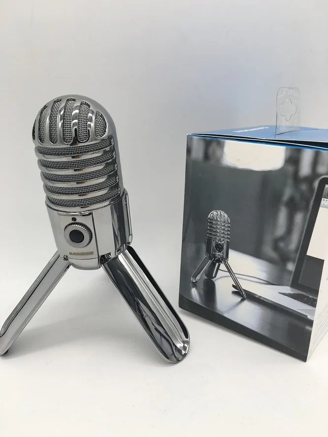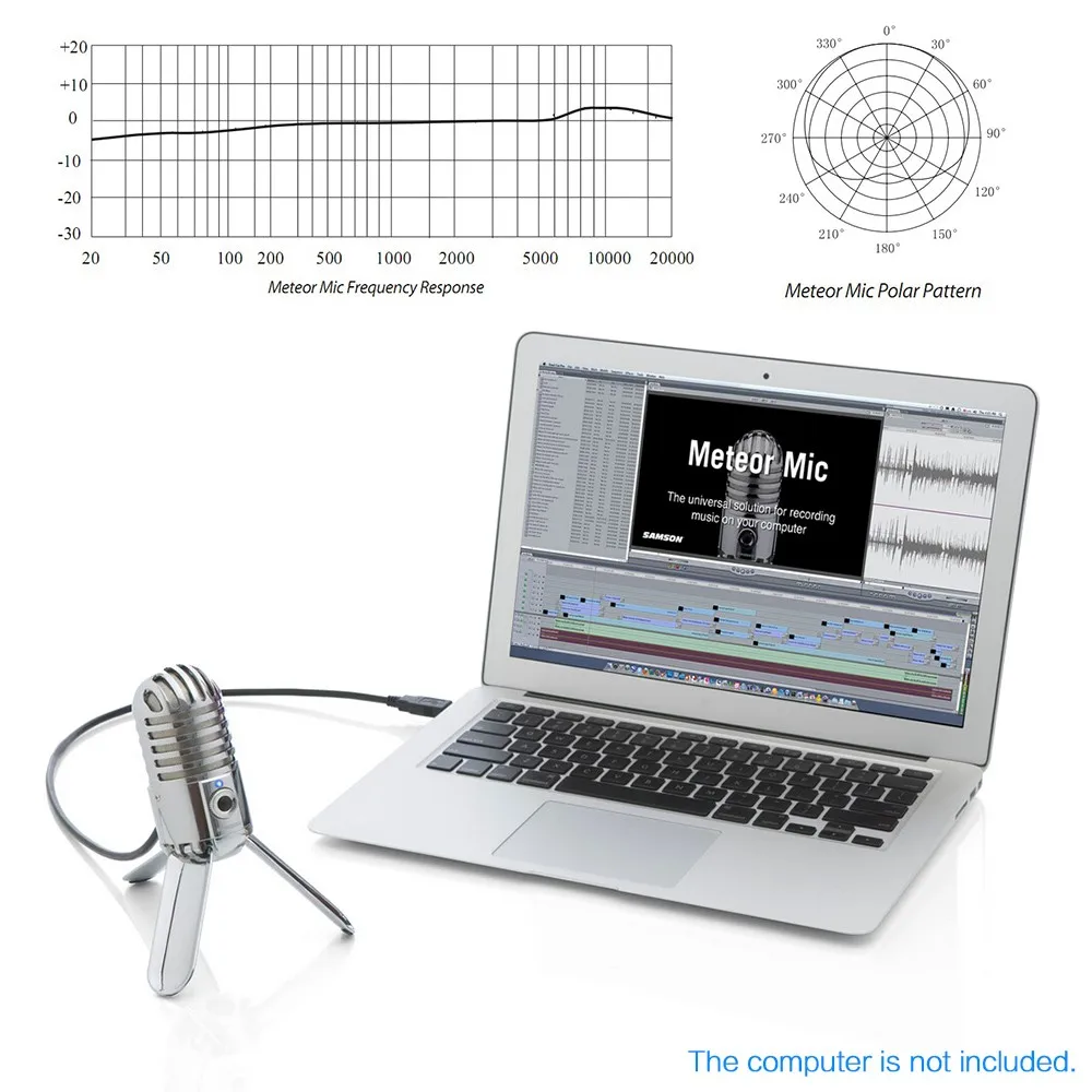 Особенности:Профессиональный студийный USB конденсаторный микрофон.25 мм Большая диафрагма, кардиоидный пикап шаблон.20 Гц-20 кГц Плавная частотная характеристика и качество CD 16 бит, разрешение 44,1/48 кГц.Прочный хромированный корпус со складывающимися задними ножками, который выглядит потрясающе на вашем рабочем столе.Ножки можно отрегулировать в оптимальное положение для любого приложения для записи от акустических гитар до вокала или речи.Встроенный стандарт 5/8 "Резьбовое крепление для установки микрофона на стрелу или настольную подставку.Стерео 1/8 "(3,5 мм) для наушников для нулевой задержкой контроля.С регулятором громкости наушников, выключателем звука микрофона и светодиодный светильник индикатора рабочего состояния.С usb-разъемом для подключения микрофона к компьютеру, не требуется драйвер и внешний источник питания.Совместим с большинством компьютерных цифровых аудио рабочих станций программного обеспечения.