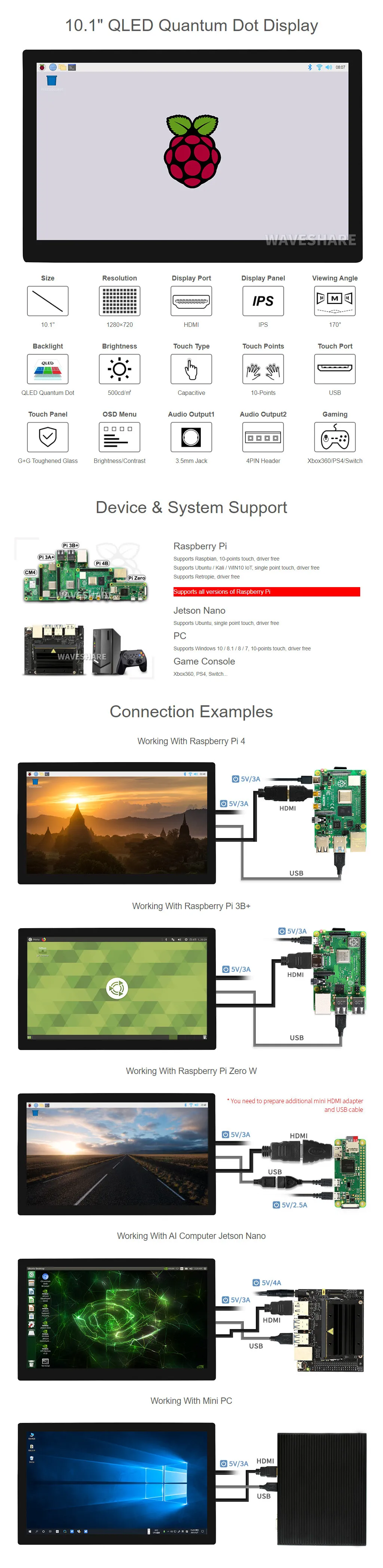 10.1inch QLED Quantum Dot Display, Capacitive Touch, 1280×720, G+G Toughened Glass Panel, Various Devices & Systems Support