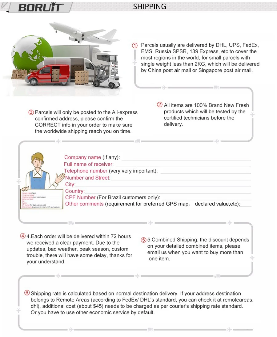 -Доставка по всему миру осуществляется через ePacket/авиа-отправление Почты Китая/UPS/FEDEX/DHL/EMS.