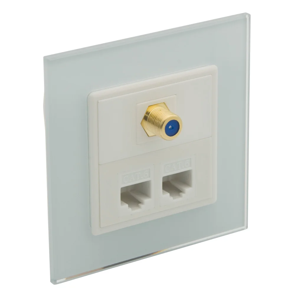 Стандартная настенная пластина европейского стиля с L 80 мм X W 80 мм. Высококачественная утолщенная стеклянная панель из закаленного стекла толщиной 4 мм. Интегрируйте 1 коаксиальный разъем F RG6 Female В гнездовой разъем. Интегрируйте 2 порта CAT6 RJ45 Female В гнездовой разъем.