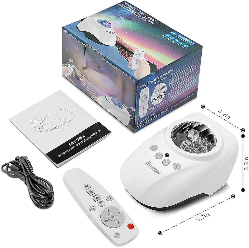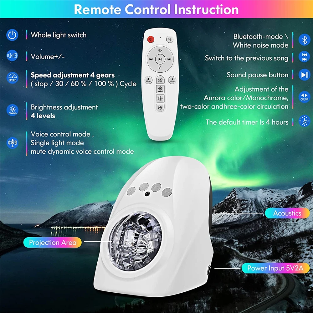 Проектор Northern светильник s star aurora имеет 5 уровней регулировки яркости (20%/40%/60%/80%/100%) и 4 уровня регулировки скоросветильник неподвижная, медленная, средняя скорость, быстрая). Также вы можете использовать пульт дистанционного управления временем (1 ч/2 ч/4 ч автоматически закрывается). Звездный проектор Galaxy projector обладает большим количеством функций, ожидая вашего изучения...