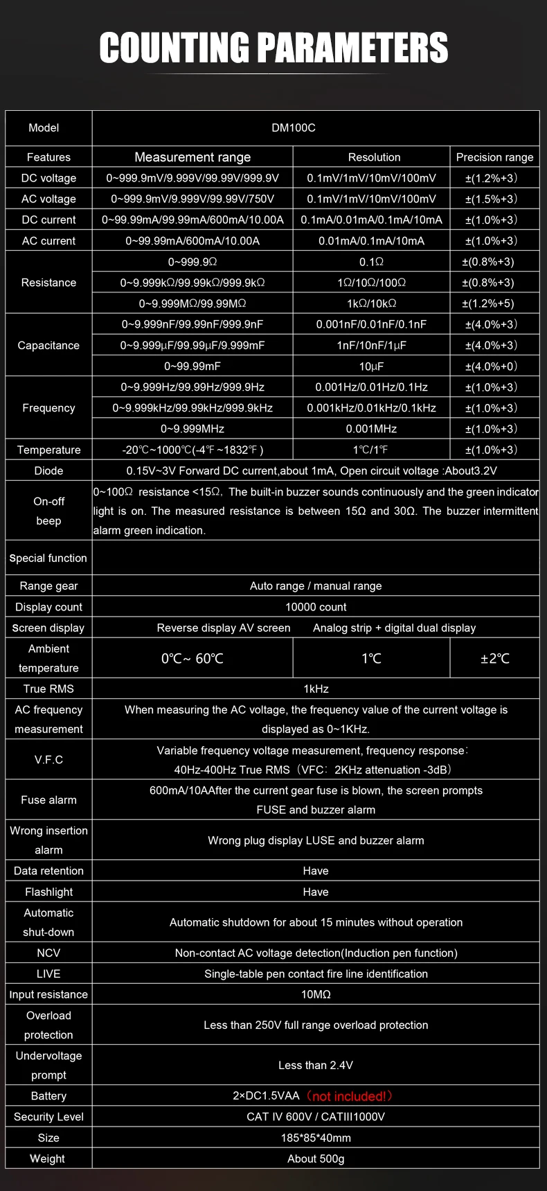 DM100C-10000 counts, smart double core,manual/auto range, object temperature measure