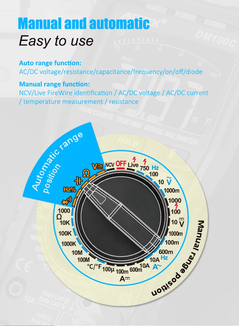 AC/DC voltage/resistance/capacitance/frequency/on/off/diode