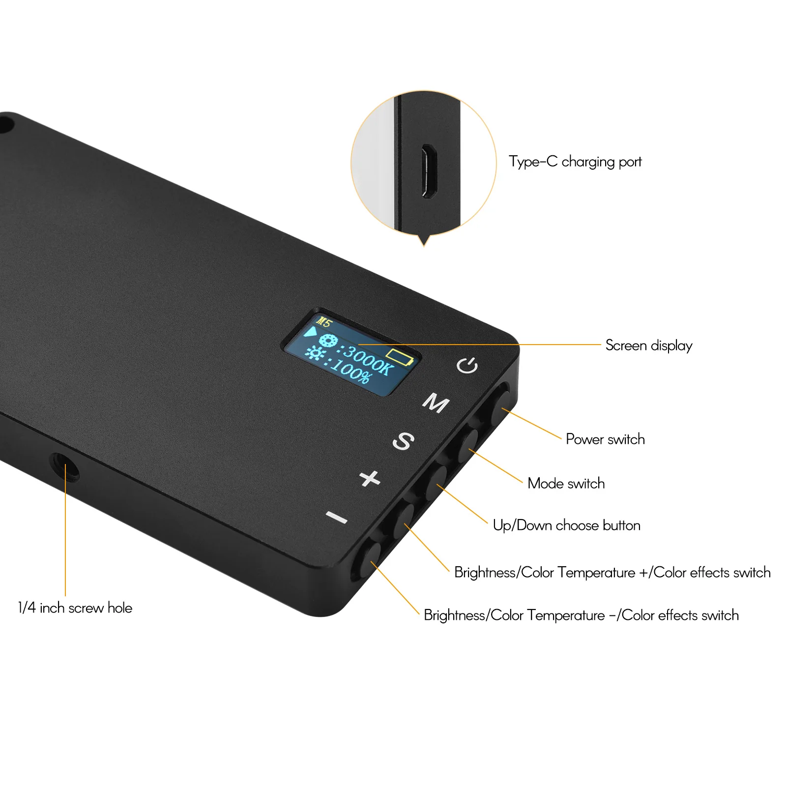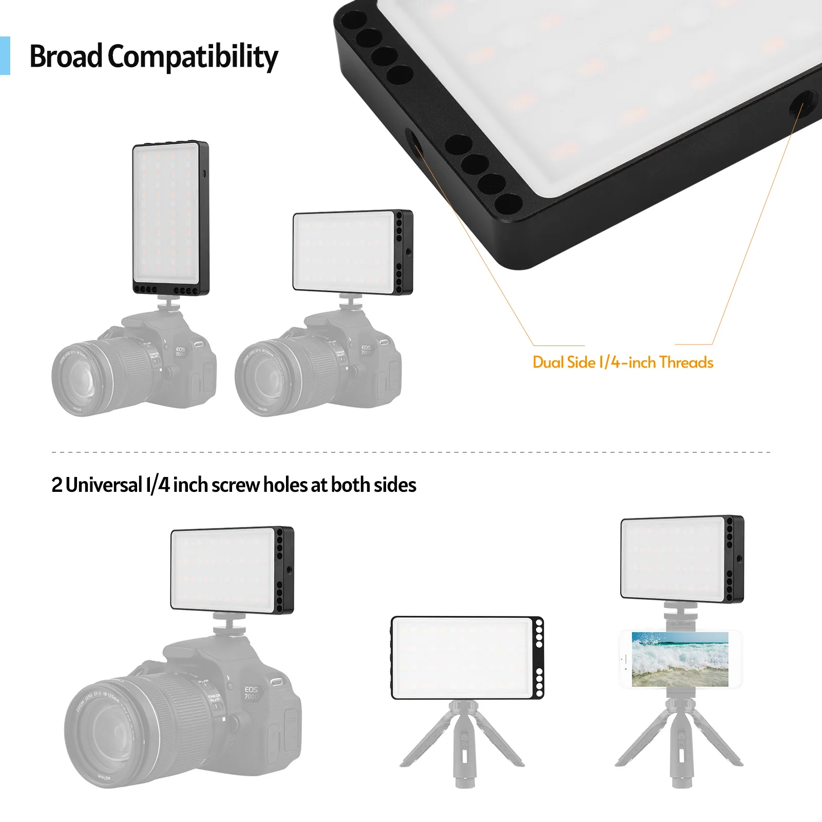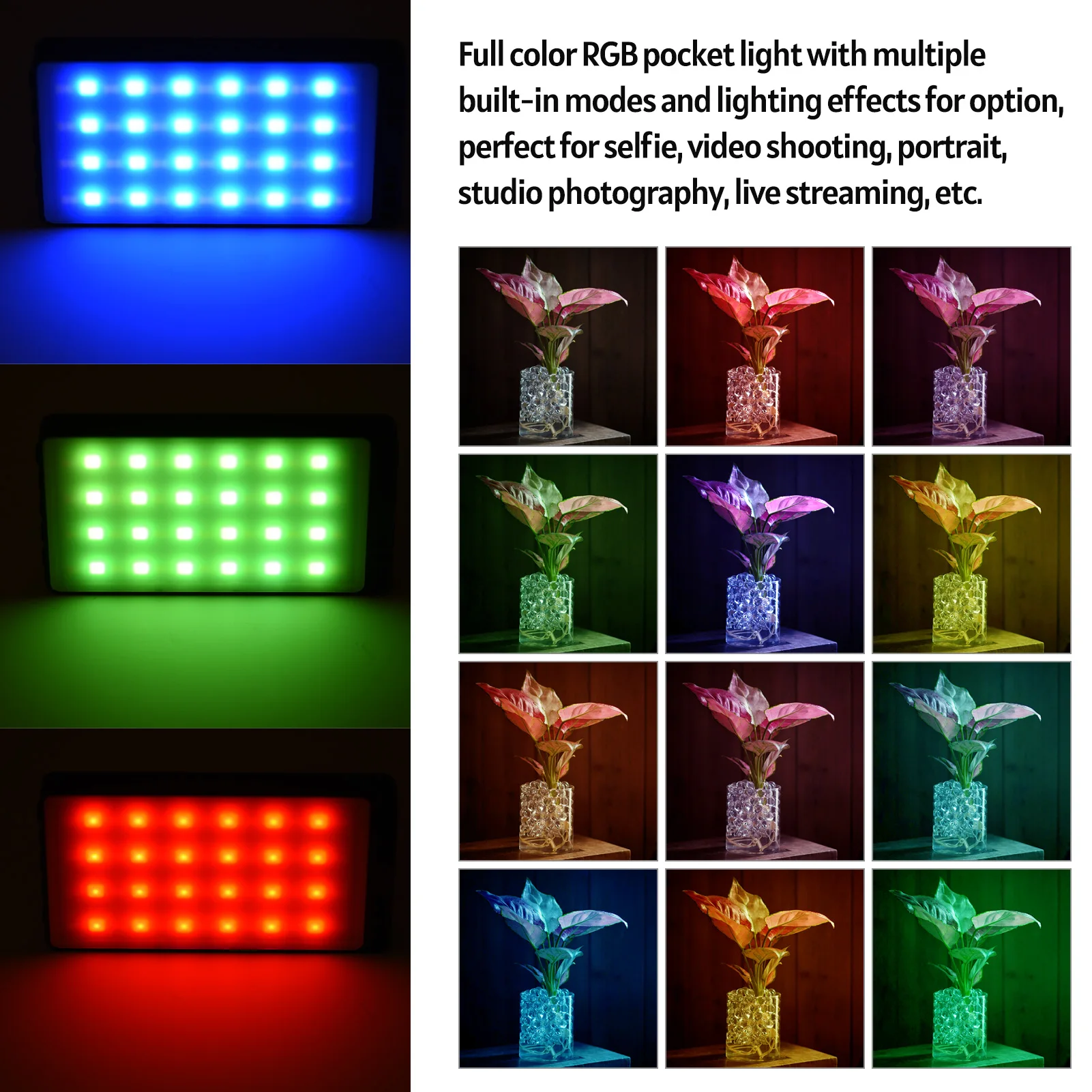 Регулируемая двухцветная температура от 3000 К до 6500 К, яркость с регулируемой яркостью 0%-100%, несколько встроенных режимов RGB и световые эффекты для выбора, удовлетворяющие ваши различные потребности, идеально подходит для селфи, видеосъемки, портретной съемки, студийной фотографии, прямого эфира и т. д.