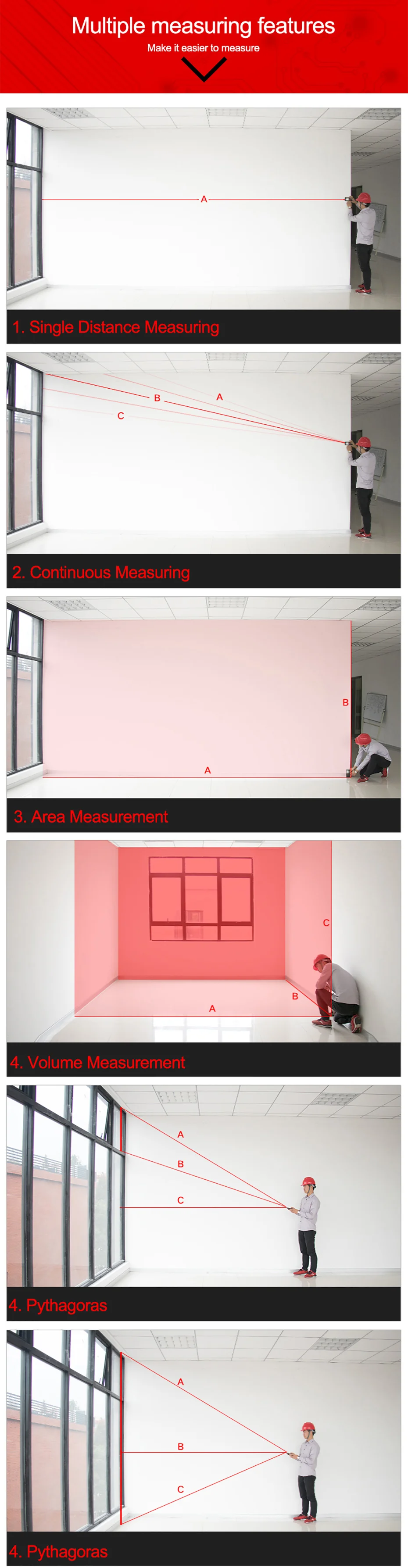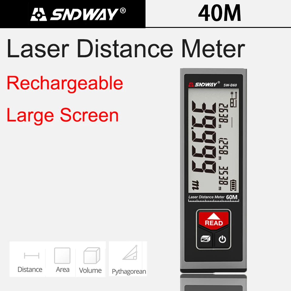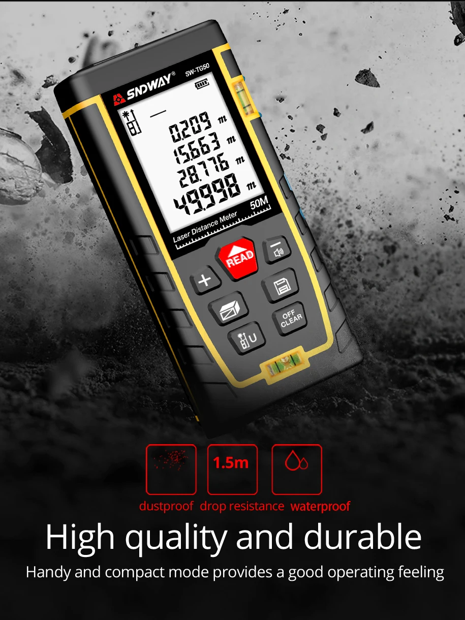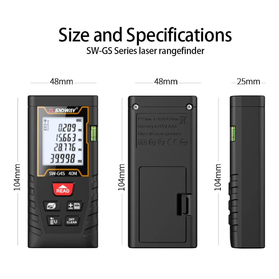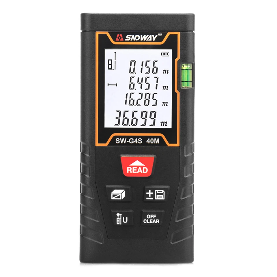 Измеритель расстояния является портативным и надежным при измерении. Зеленый лазер четче даже на открытом воздухе, что делает ваши измерения более точными, простыми и быстрыми. Дальномер может быть широко использован в строительстве и промышленности, особенно в больших областях, таких как комнаты, квартиры, здания, недвижимость, фабрики и т. Д.
