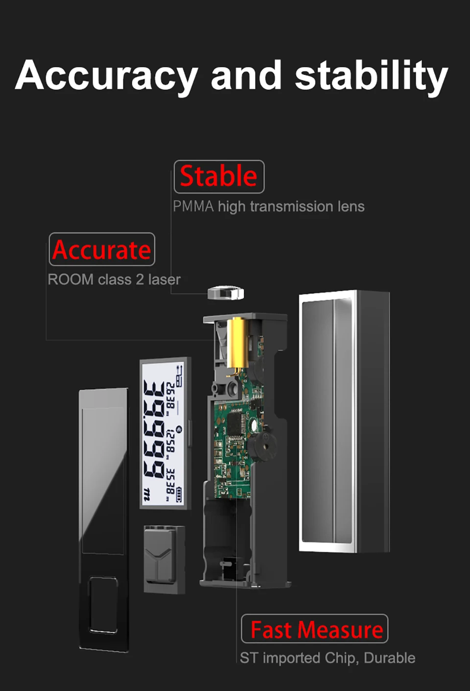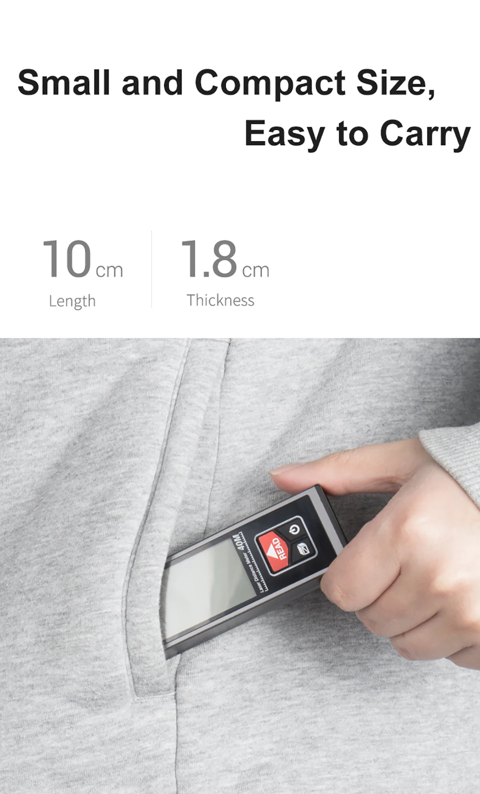 Характеристики: точность миллиметра-оснащен высокоскоростным чипом алгоритма и модернизированным объективом, Этот измеритель обеспечивает стабильное и точное измерение с точностью ± 2 мм. Возможности-0,1 s Быстрое измерение расстояния, площади, объема, косвенного измерения с помощью теоремы Пифагора. Практические функции-устройство переключается между метрами (м), дюймами (в), ногами (ФТ); Автоматическое отключение в 150 с. Оставайтесь точным-с самокалибровкой, которая позволяет пользователям калибровать счетчик, когда это необходимо, с регулировкой в диапазоне от-9 до 9 мм. Встроенный перезаряжаемый аккумулятор имеет большую емкость 850 мАч и может быть легко заряжен через usb-кабель Type-C. Мини-размер-он достаточно мал, чтобы поместиться в любую куртку или карман для брюк, широко используемый в интерьере, дизайне в помещении, строительной сфере.