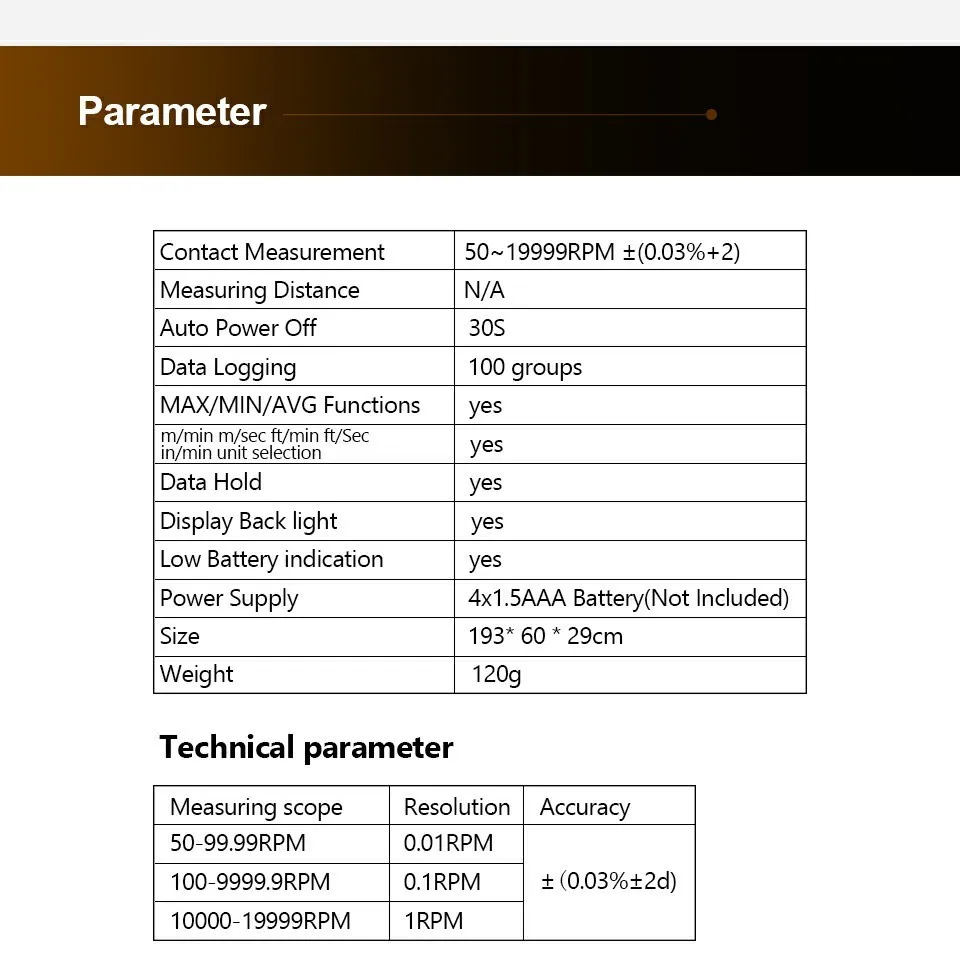 Особенности: Измерение контакта 50 ~ 19999 ОБ/мин ±(0.03% + 2) Расстояние измерения N/A Автоматическое отключение питания 30S Макс/мин/AVG функции √ M/min m/sec ft/min ft/sec in/min Выбор единицы измерения √ Регистрация данных 100 групп Хранение данных √ Светодиодный задний светильник √ Индикация низкого заряда батареи √ Общий Источник питания 4 × 1,5 V AAA Батарея Вес Approx.120g Размер 193 мм × 60 мм × 29 мм Степень безопасности CE RoHS
