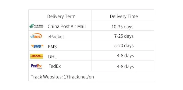 1. Заказ будет отправлен в течение 3-5 рабочих дней после оплаты. 2. Мы предоставляем бесплатную доставку через авиа-отправление Почты Китая, ePacket и Aliexpress. Если вы хотите выбрать другой способ доставки, пожалуйста, Оплатите стоимость доставки. Как показано ниже, приблизительная скорость доставки для справки. (Если заказ превышает $100, мы отправим через DHL или UPS, бесплатная доставка) 3. Пожалуйста, проверьте товар в пути по номеру отслеживания. Если вы не получили товар через 30 дней, пожалуйста, немедленно свяжитесь с нами.
