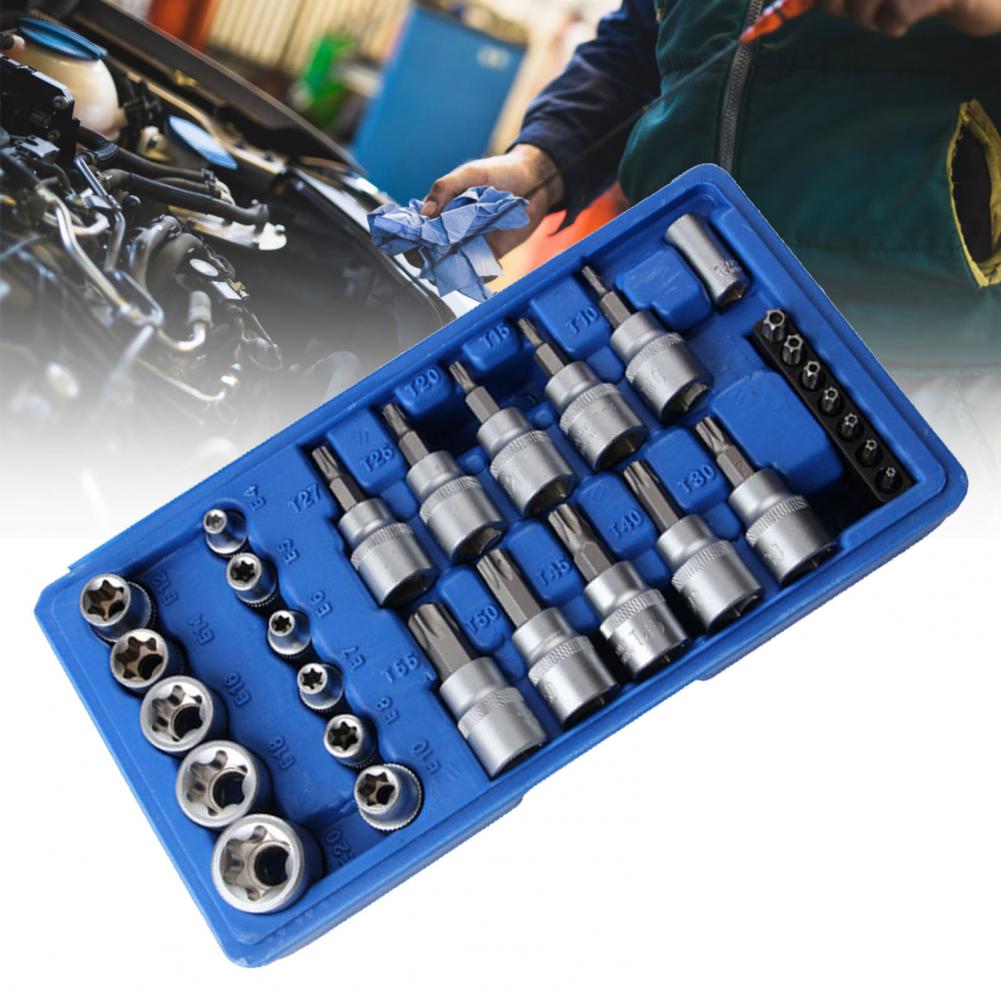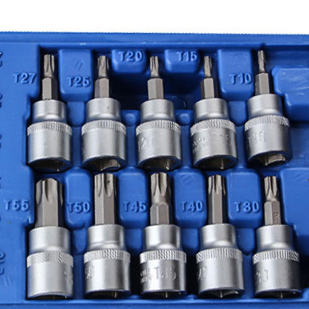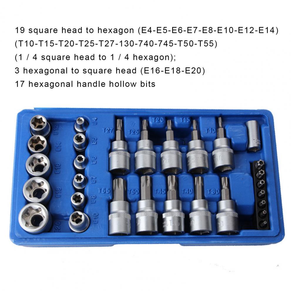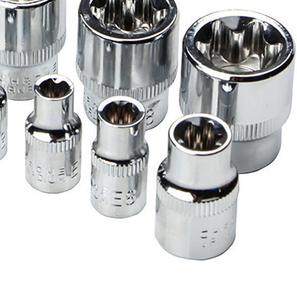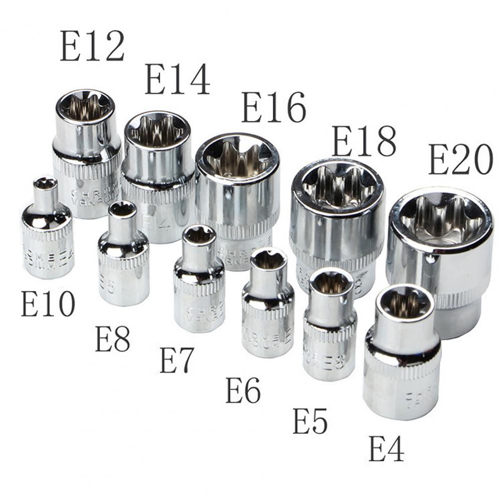 Шестигранный торкс e-тип Размер гнезда 3/8 дюйма (E10, E12, E14, E16, E18, E20), 1/4 дюйма (E4, E5, E6, E7, E8); шестигранная Отвертка торкс Размер гнезда 3/8 дюймов (T10, T15, T20, T25, T27), 1/2 дюйма (T30, T40, T45, T50, T55); Шестиугольные коронки со средним размером отверстия (T8, T10, T15, T20, T25, T27 , T30); шестиугольник бит гнездо размер 1/4 дюймов (6,35 мм).