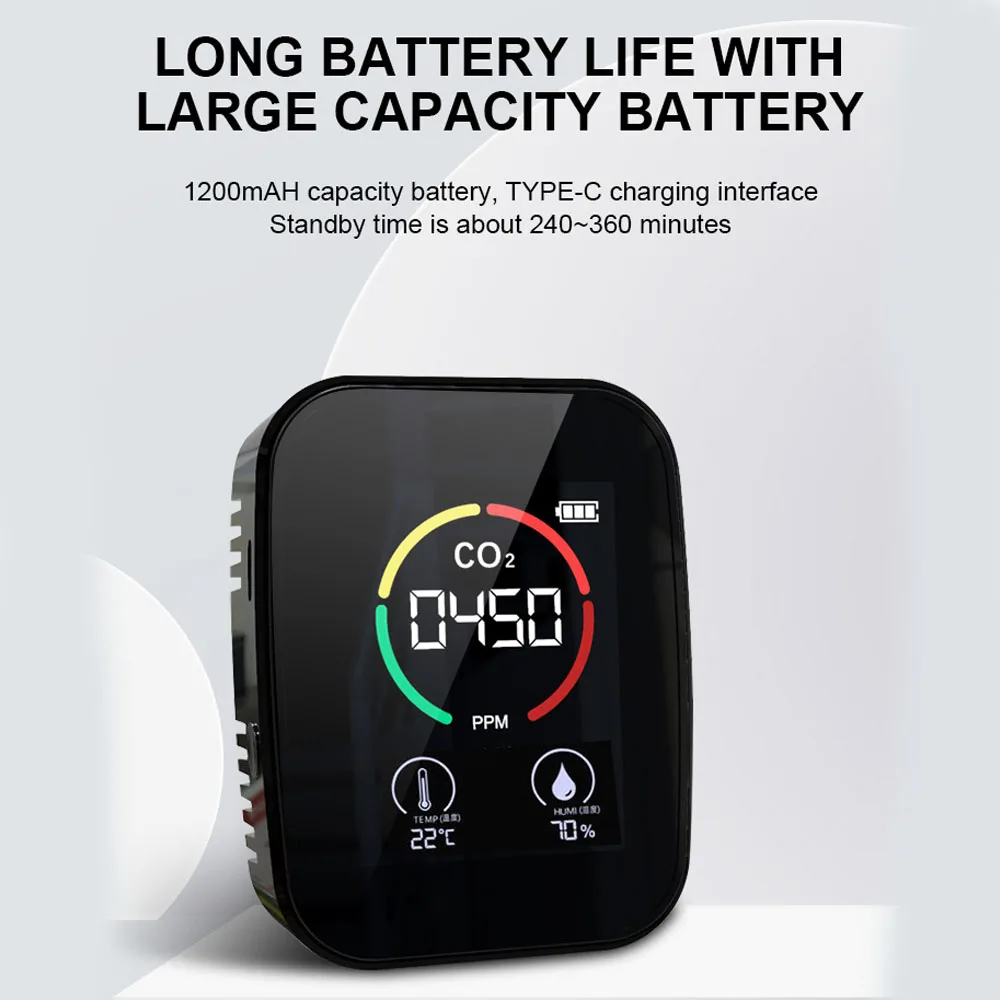 5 в 1:Большой экран отображает мощность, значение CO2, значение TVOC, значение HCHO, температуру и влажность.