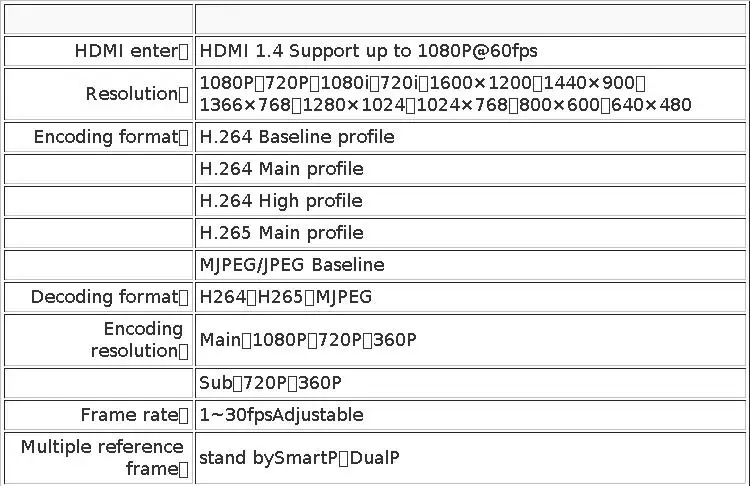 Характеристики продукта: HD вход, мульти-Протокол прямой трансляции, мульти-платформенная прямая трансляция, высокая степень сжатия, расширенная функция rtsp/rtmp/http, многоканальная потоковая передача данных H.265 + Обновление системы smartP, параметры определения интерфейса группового управления основной чип производительности: Hi3516EV300 CPU : ARM Cortex-A7 @ 900MHz 32KB I-Cache, 32 КБ D-кэш-память: 128 Мб DDR3 FLASH: 128 Мб