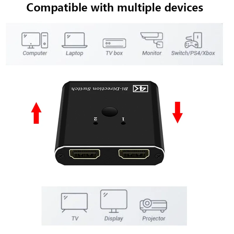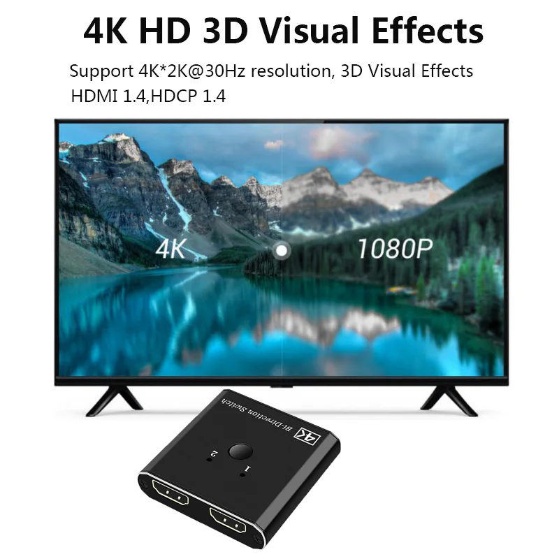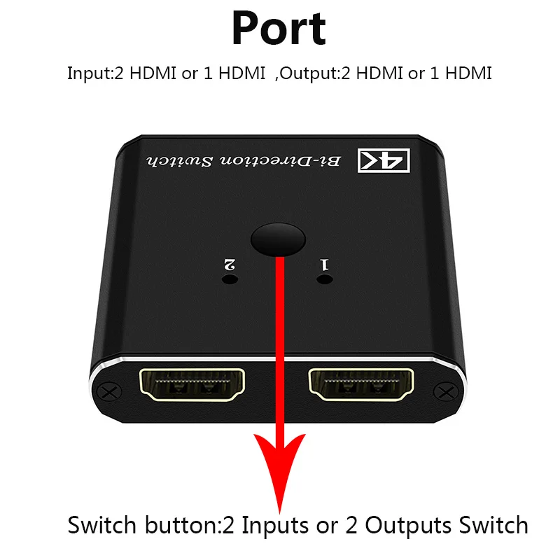Это одно устройство, совместимое с HDMI, 2 порта, двухнаправленный ручной коммутатор. Он может легко Переключить два маршрута источника HD на любой hd-дисплей или проектор. Также он может распределить один источник HD на два hd-дисплея или проектор.