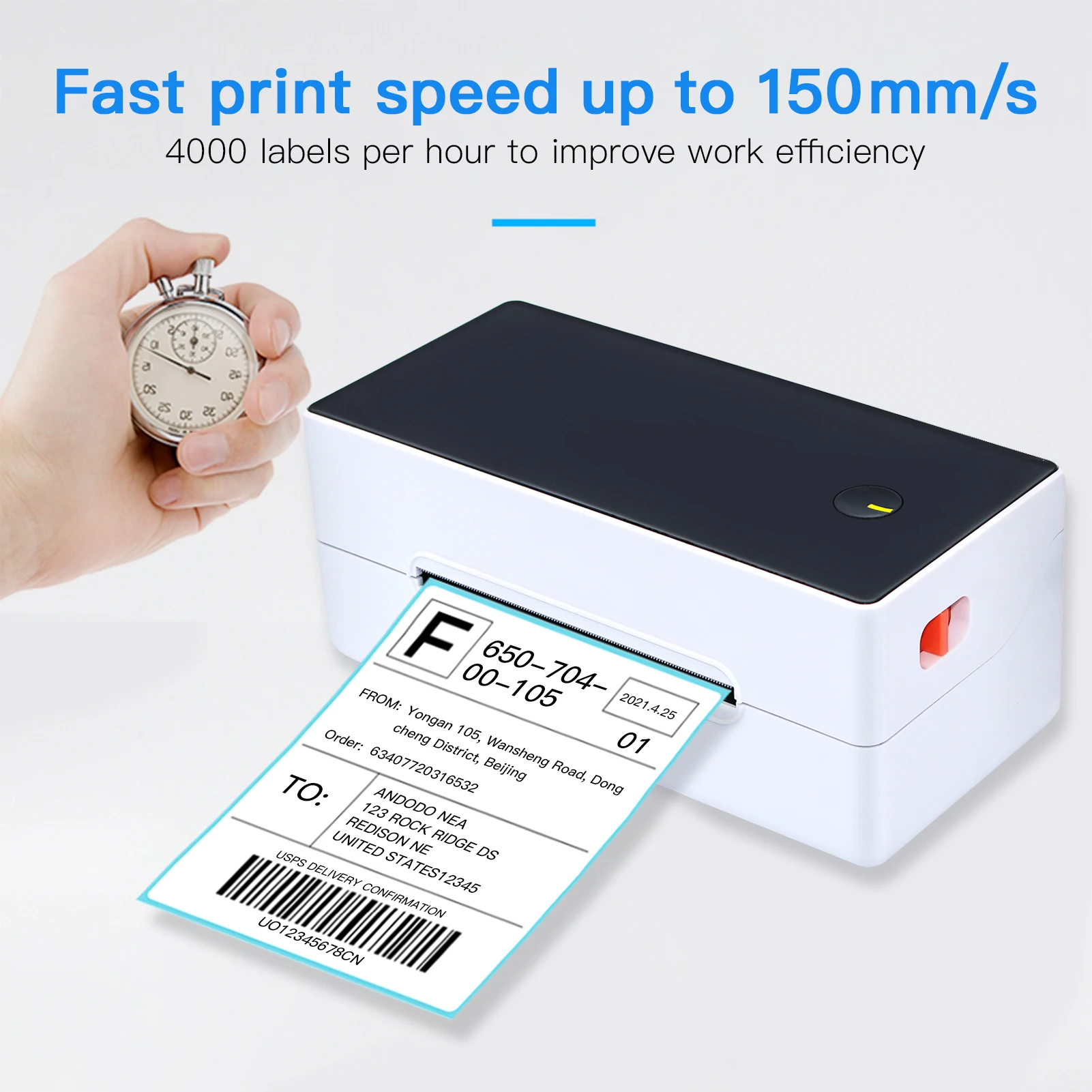 Высокое качество печатающей головки, разрешение 203DPI, четкое качество печати и надежная производительность, высокая скорость печати, 4000 этикеток в час для повышения эффективности работы, скорость может достигать макс. 150 мм/секции.