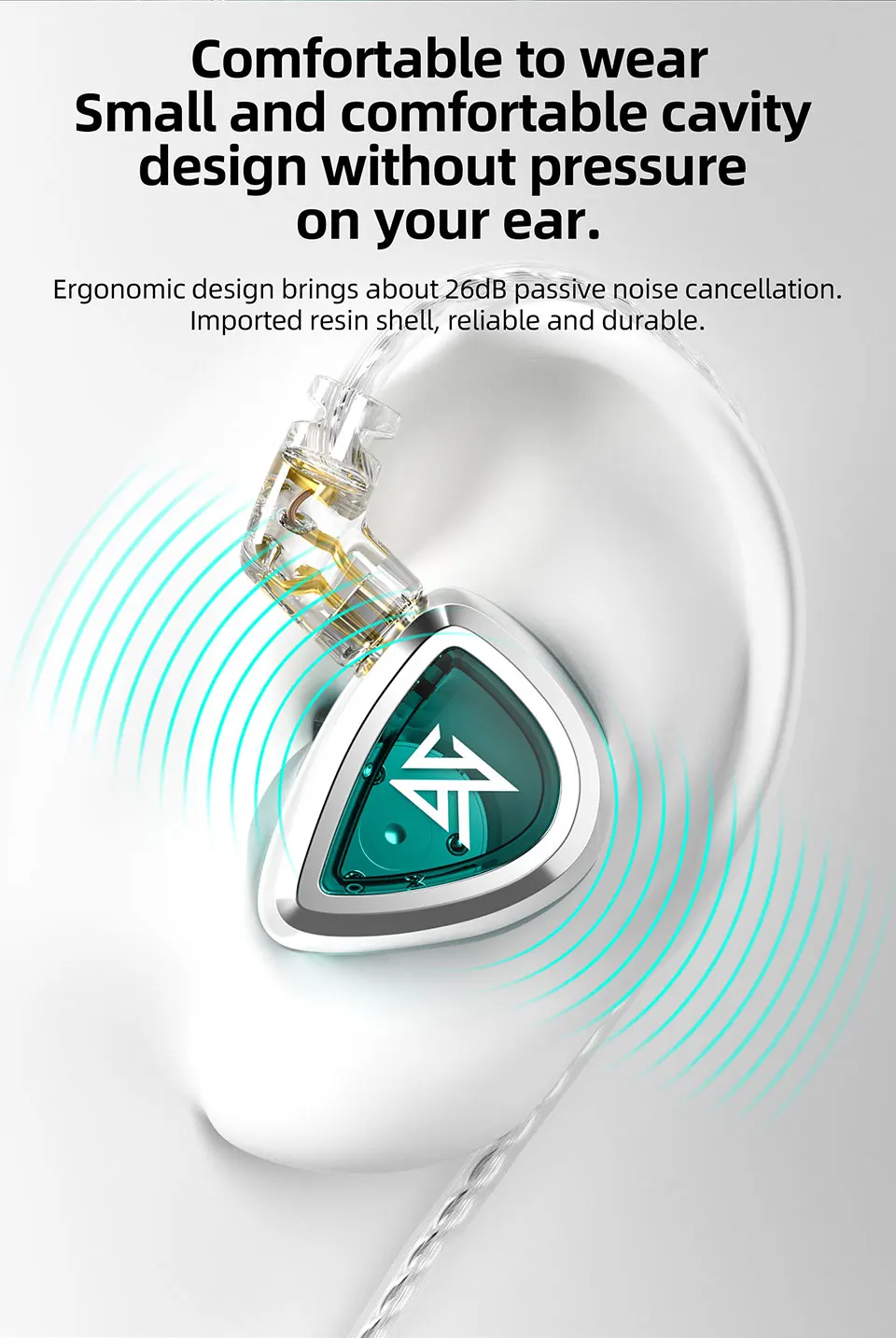 Ergonomic design brings about 26dB passive noise cancellation. Shell is made from imported resin, reliable and durable. Small and comfortable cavity design without pressure on your ear, ideal for use for long hours.