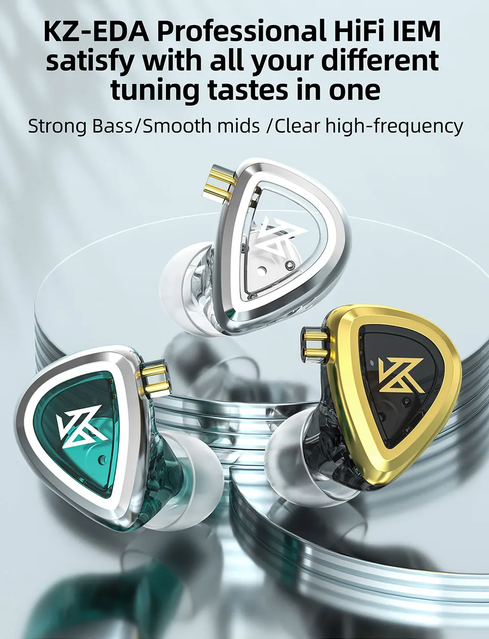 A professional KZ technical team designed a set of KZ EDA dynamic earphones with various combo settings. Pay the price for one earphone, but get three sets of different tuning to satisfy all your Hi-Fi music demands. KZ EDA earphones set has a professional acoustic tuning with an accurate frequency crossover to achieve excellent sounds performance.You get Bass-heavy tuning with the Gold ones, a balanced profile with the Silver ones, and a detailed, high-resolution tuning with the Green EDA.