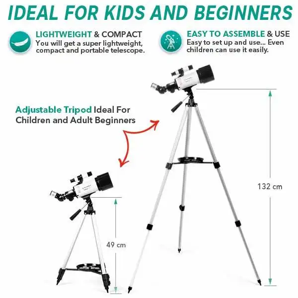 Вы получите невероятную четкость и яркость с четкими, острыми и яркими изображениями благодаря исключительной оптике... плюс вы также получите супер мощный объектив телескопа в компактной, портативной и быстрой сборке, так что вы Можно легко увидеть луну и ближайшие планеты... он прост в использовании даже для детей... Этот телескоп станет идеальным подарком для любого ребенка или взрослого новичка... не ждите больше и воспользуйтесь преимуществами это предложение