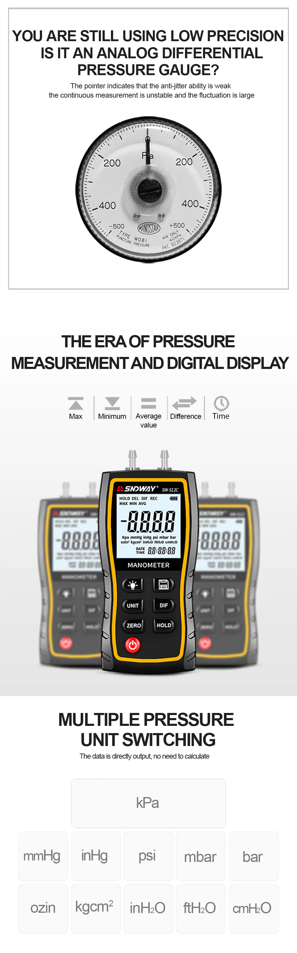 SNDWAY manometer can measure differential pressure/positive pressure/negative pressure, multi-unit option: kPa, mmHg, inHg, psi, mbar, bar, ozin, kgcm, inH O, ftH O, cmH2O.It is a indispensable measuring apparatus to heating and ventilation air-conditioning for technicians, operating maintenance engineers, and scientific researchers for its simply operation and distinct reading.