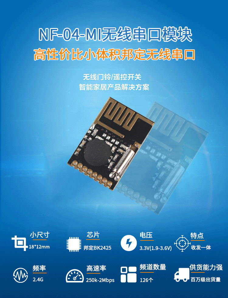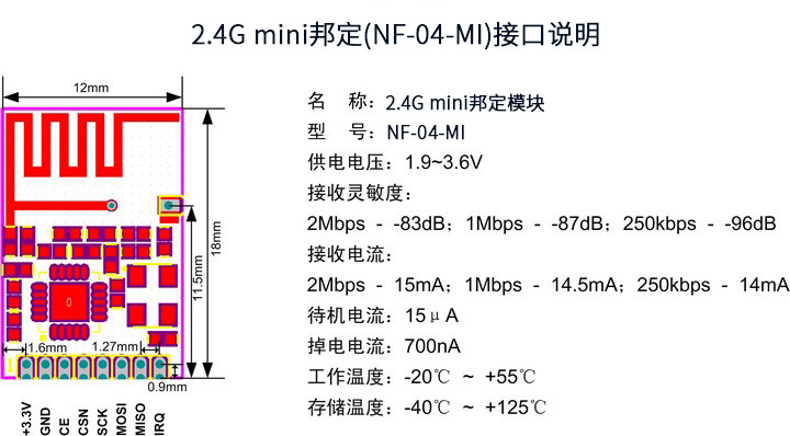 NF-04-MI-это беспроводной модуль 2,4G с технологией штамповочного отверстия, высокой скоростью воздуха (до 2 Мбит/с), с использованием интерфейса SPI, чистого аппаратного модуля с интегрированным трансивером; Высокая стабильность, высокая производительность, хороший спектр тестовых характеристик, малый объем, с использованием всего промышленного класса компонентов. В настоящее время, Он был массовым и доставлен на миллионы уровней и подходит для различных сценариев применения. NF-04-MI можно широко использовать в различных случаях использования в Интернете, подходит для беспроводных ключей и мышей, беспроводного дистанционного управления, оборудования для обнаружения движения, активной RFID, NFC, низкомощный ad-hoc сетевой Беспроводной Датчик Сетевые узлы, И т. Д., является идеальным решением для интернет-приложений вещей. NF-04-MI инкапсулируется с отверстиями для штампов. Он может быть быстро подключен к существующим продуктам, будь то для обучения или массового производства, и очень прост в использовании.