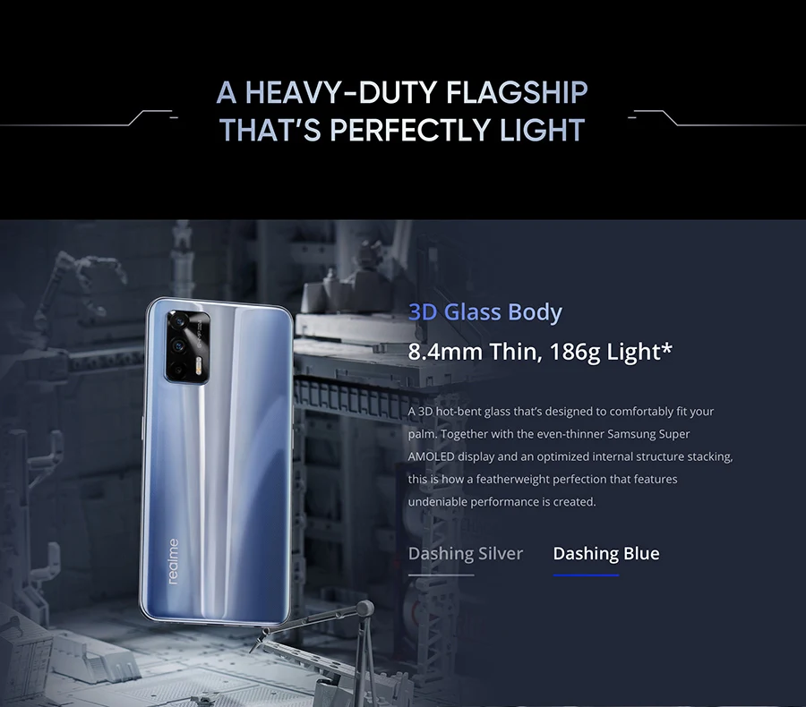 Made with a 6.43-inch Samsung Super AMOLED gaming screen, the realme GT perfectly blends a 120Hz ultra-high refresh rate and 360Hz Touch Sampling Rate with a 100% P3 wide color gamut and 98% NTSC color saturation to present colors just the way you see them in real life.