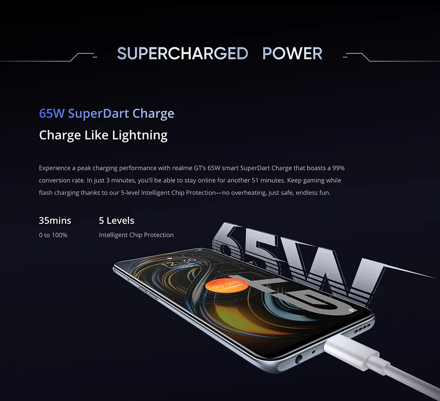 Experience a peak charging performance with realme GT’s 65W smart SuperDart Charge that boasts a 99% conversion rate. In just 3 minutes, you’ll be able to stay online for another 51 minutes. Keep gaming while flash charging thanks to our 5-level Intelligent Chip Protection—no overheating, just safe, endless fun.