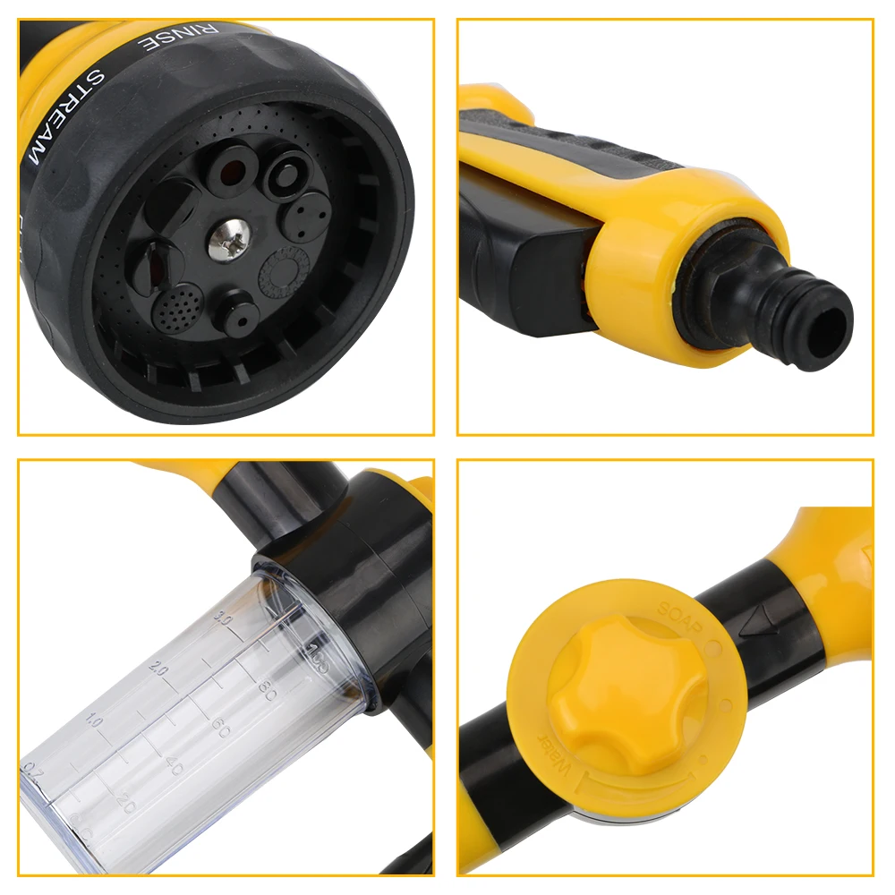 Особенности: Изготовлен из АБС-пластика, что делает это сопло шланга прочным и стойким к ржавчине. Специальная ручка для регулировки потока воды и экономии усилий. Эта насадка для шланга имеет 8 режимов и 3 ранга регулируемого переключателя управления пеной, удовлетворяет различные потребности распыления. Можно положить в моющее средство. Он выливает воду или мыльную воду без протечек. Эргономичная рукоятка обеспечит комфортное касание и Нескользящий Захват. Используется для очистки автомобиля, сада или бассейна. Технические характеристики: Материал: АБС-пластик Цвет: черный/желтый Вес: 233 г Размер: (как показано на картинке) Посылка включает в себя: 1 х пистолет для мытья пены автомобиля