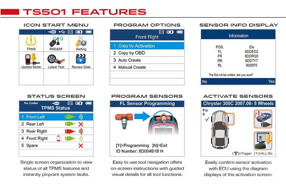 MaxiTPMS TS501 способен беспроводно диагностировать проблемы TPMS, а также активировать любые известные OEM/Универсальные датчики TPMS, идентификационные Клон или перепрограммируемые датчики на ECU транспортного средства и выключить предупреждающие огни.