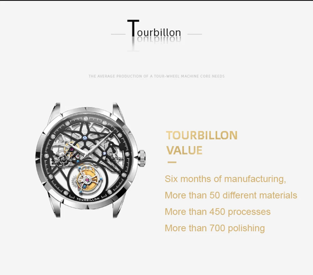 Турбийон-это своего рода устройство регулирования скорости часов, изобретенное швейцарским мастером Луи Баоцзи в 1795 году. Цель механизма маховика заключается в исправлении ошибок, вызванных гравитацией. Часы Tourbillon представляют собой самый высокий уровень в процессе производства механических часов и всегда были известны как «Король часов».