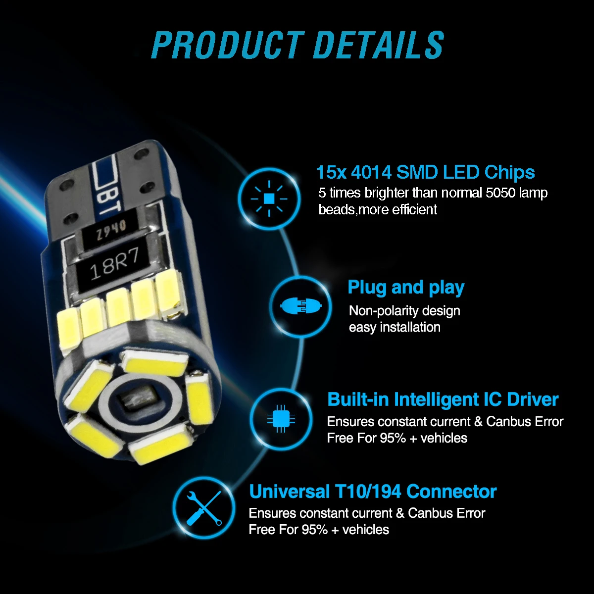 * Canbus Ошибка бесплатно: Встроенный декодер Canbus проходит проверку ошибок для большинства автомобилей, отсутствие мерцания (при использовании в качестве номерного знака светильник, небольшой процент транспортных средств будет иметь проблемы с совместимостью)