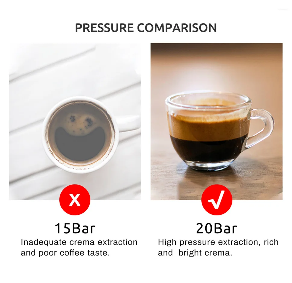 ✔【 20 бар система давления: 20 бар насос высокого давления может обеспечить быстрое и стабильное извлечение, делает эспрессо более ароматным и богатым crema.