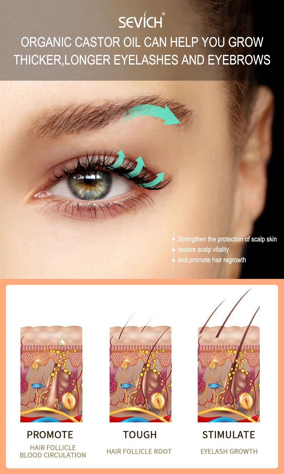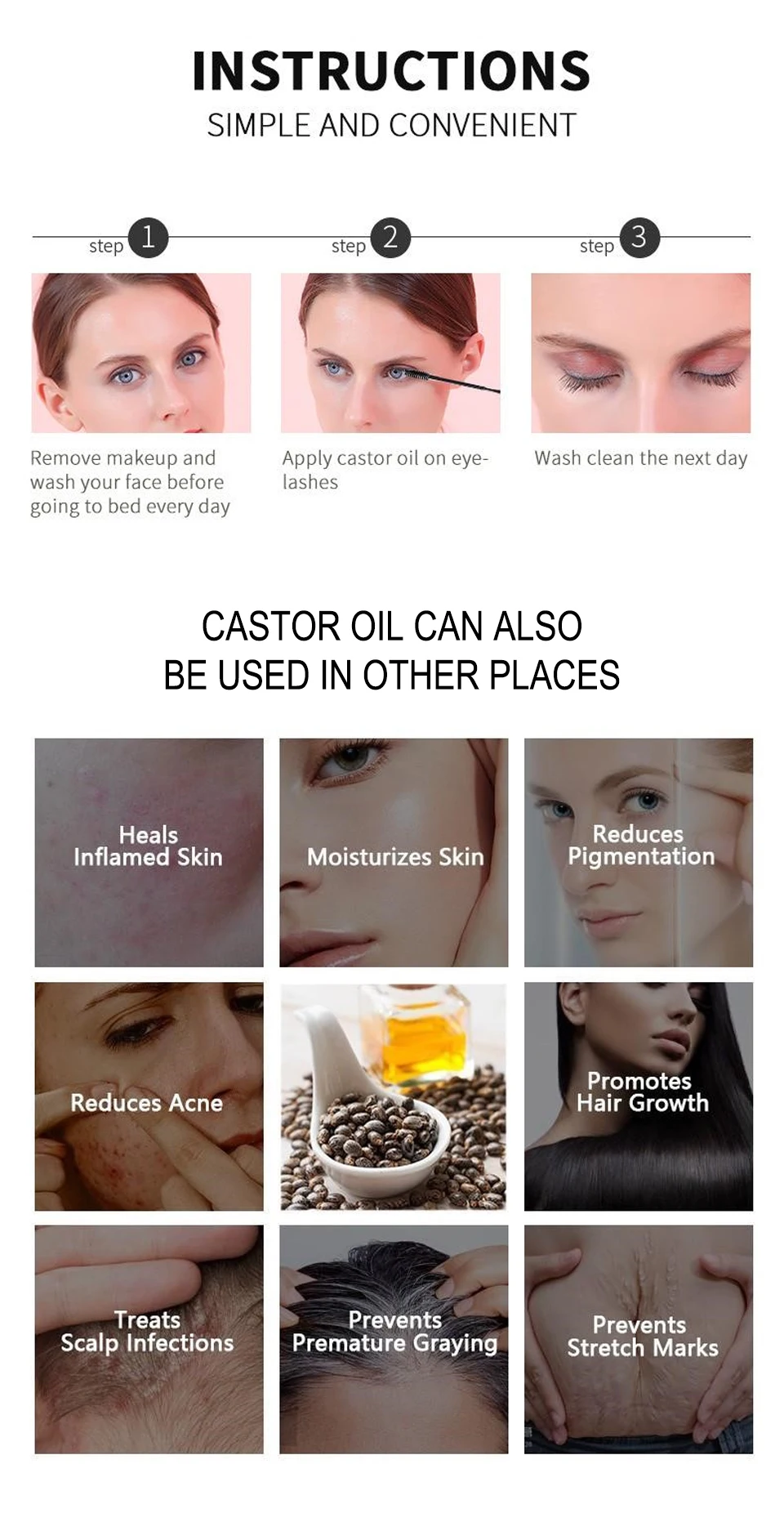 Это касторовое масло может использоваться для защиты от выпадения волос, роста ресниц, густых ресниц, способствует росту волос, помогает сгладить рубцы и растяжки, увлажнить и антибактериальное.