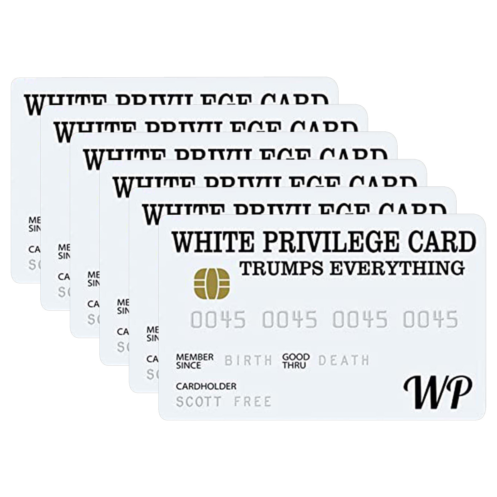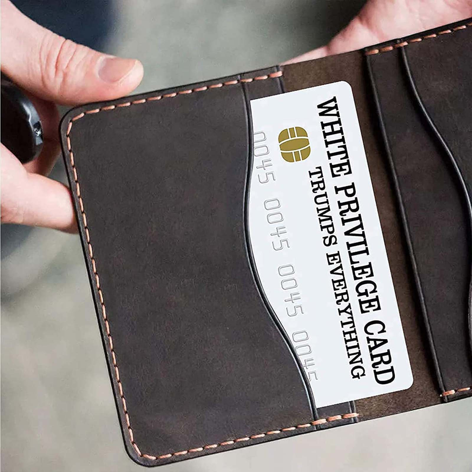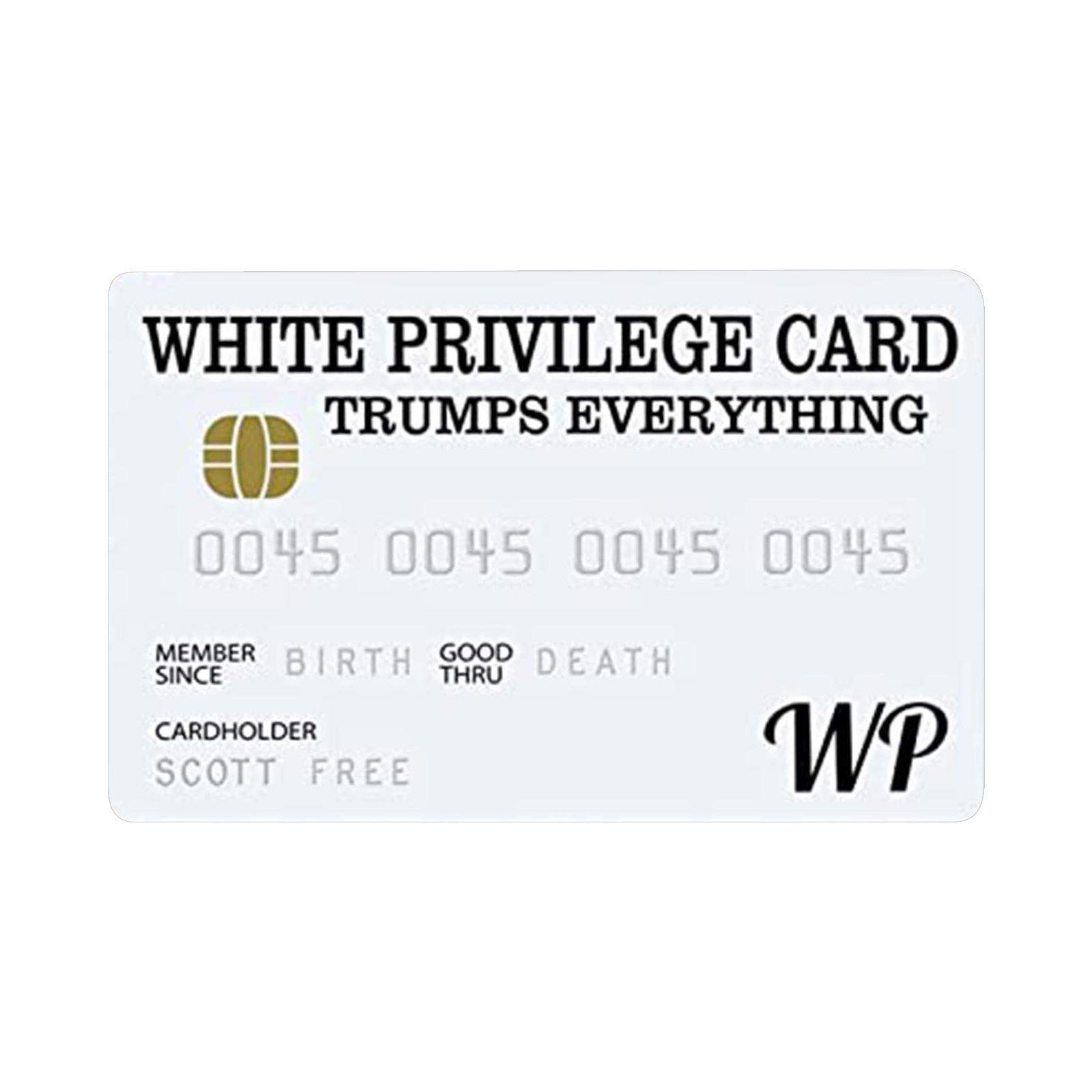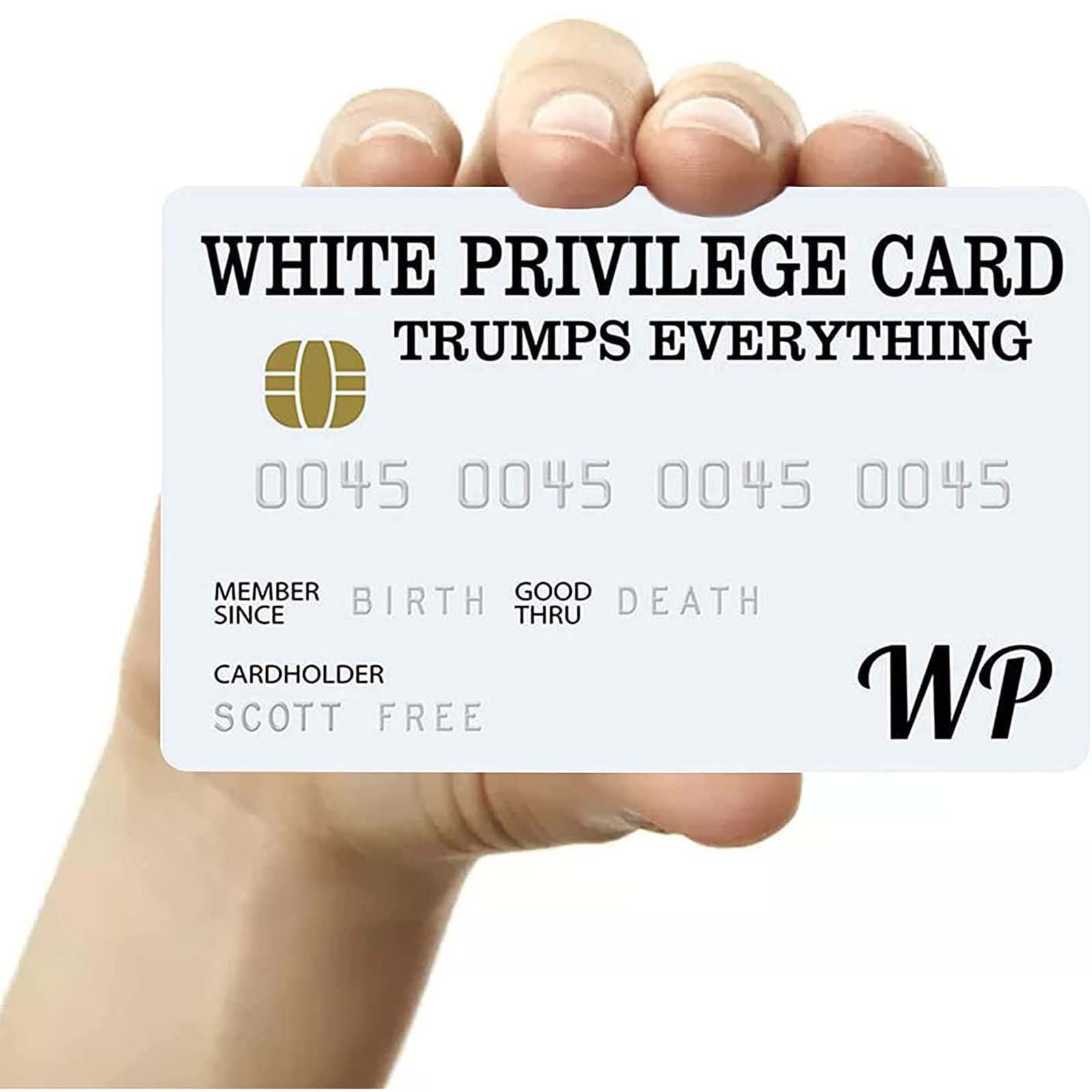 White Privilege Card козырек всем. Эта карта предоставляет своего носителя Счастье и успех, потому что это ваш цвет, а не выбор Вы делаете так, чтобы определить свои способности, чтобы быть успешным.