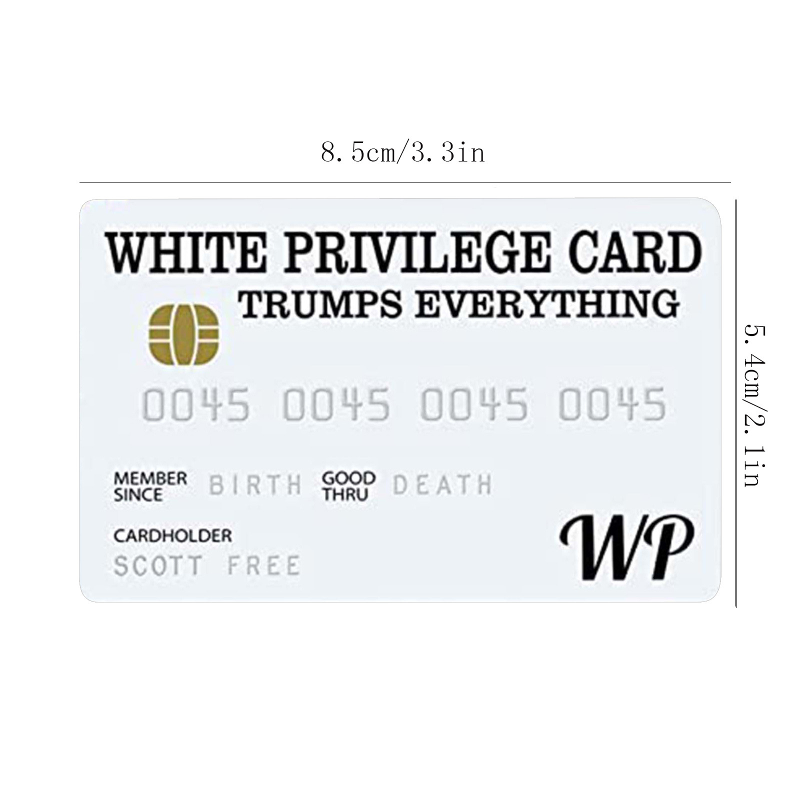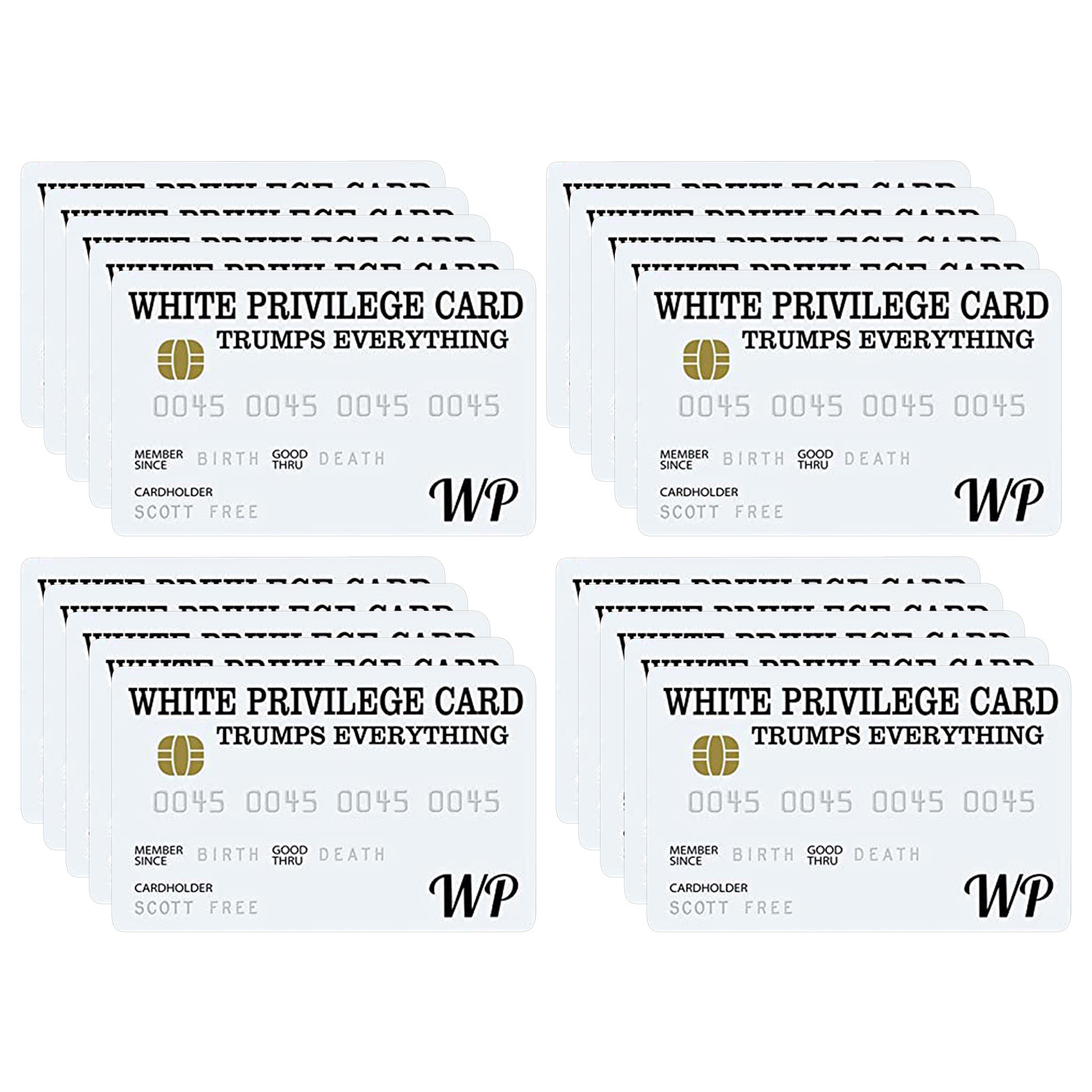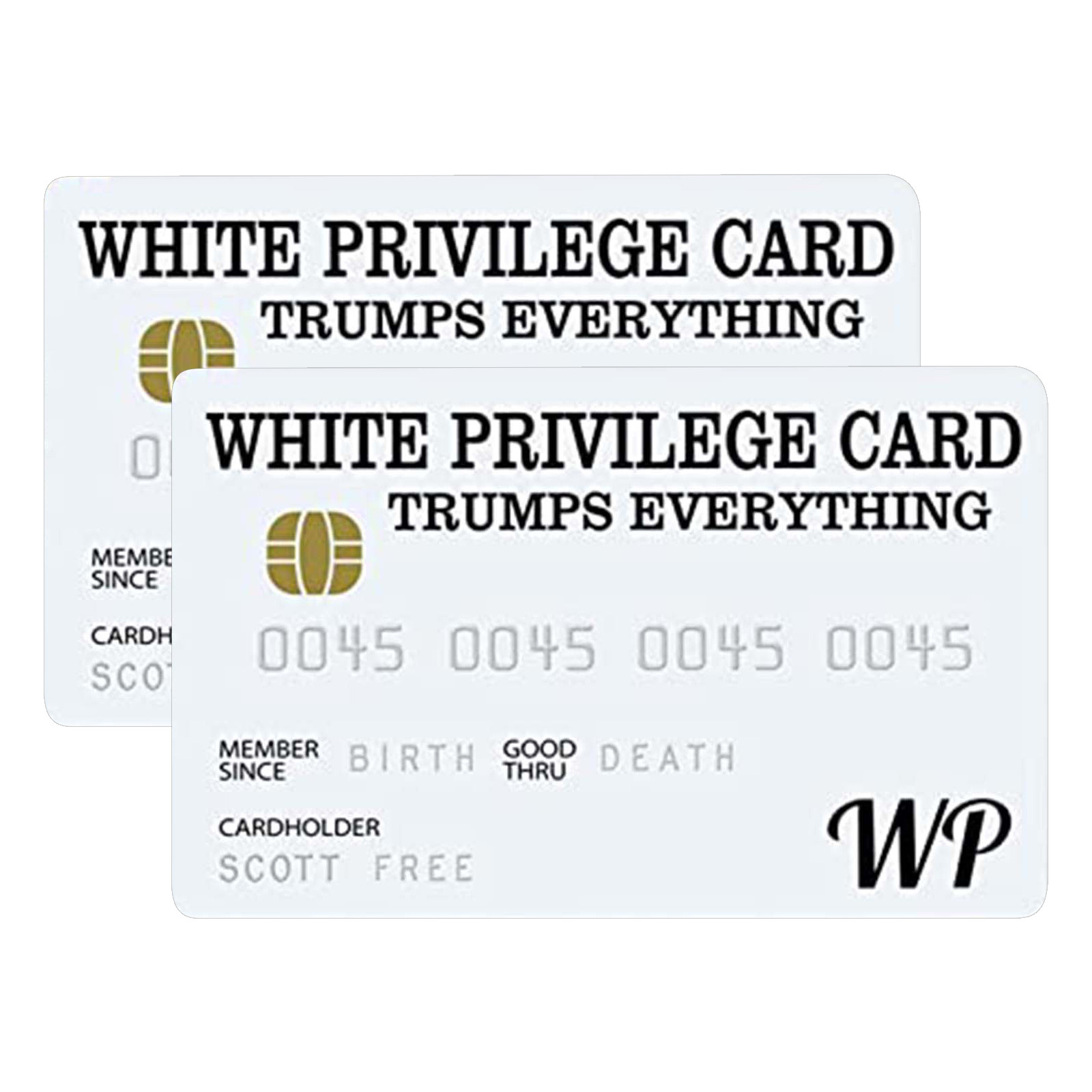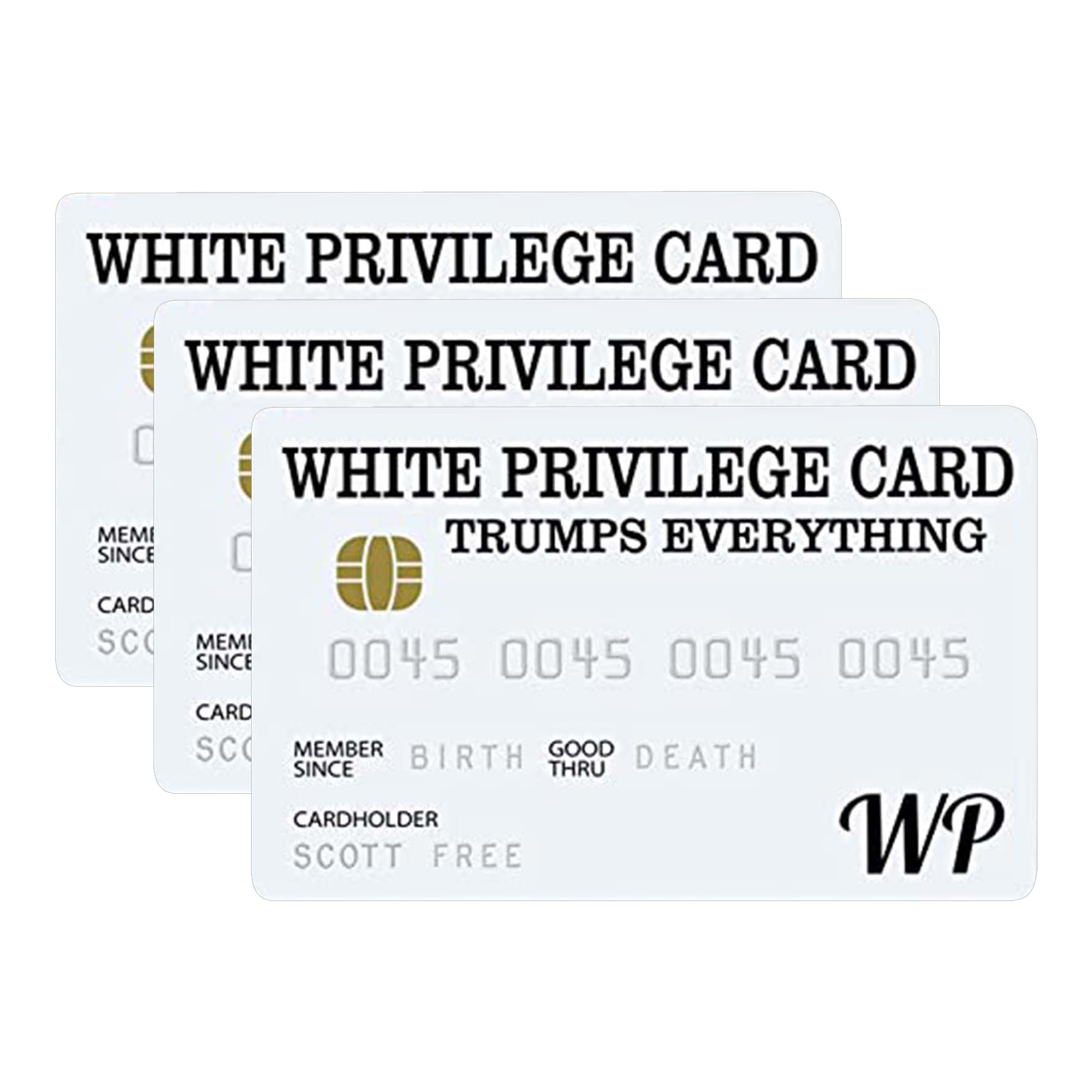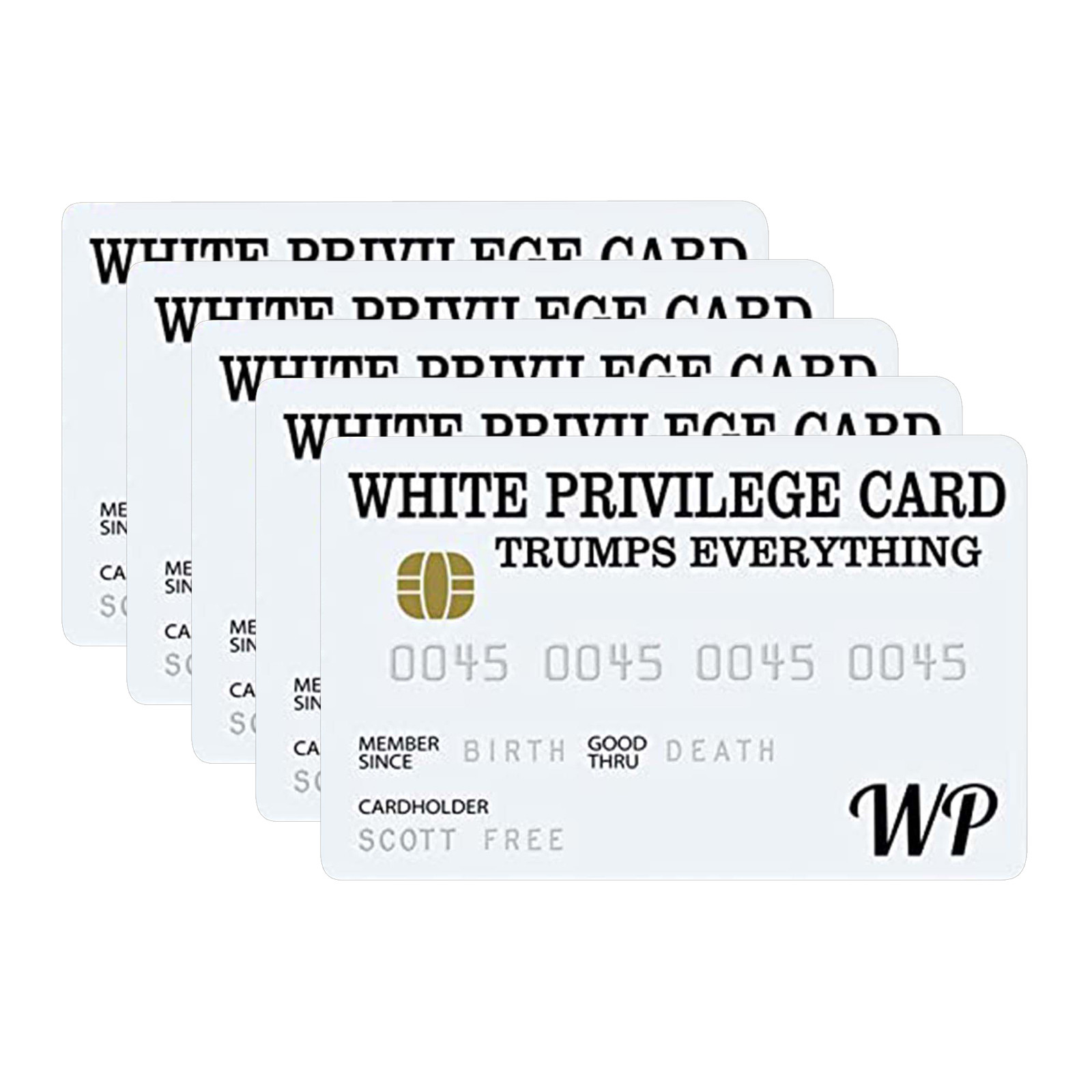 White Privilege Card козырек всем. Эта карта предоставляет своего носителя Счастье и успех, потому что это ваш цвет, а не выбор Вы делаете так, чтобы определить свои способности, чтобы быть успешным.