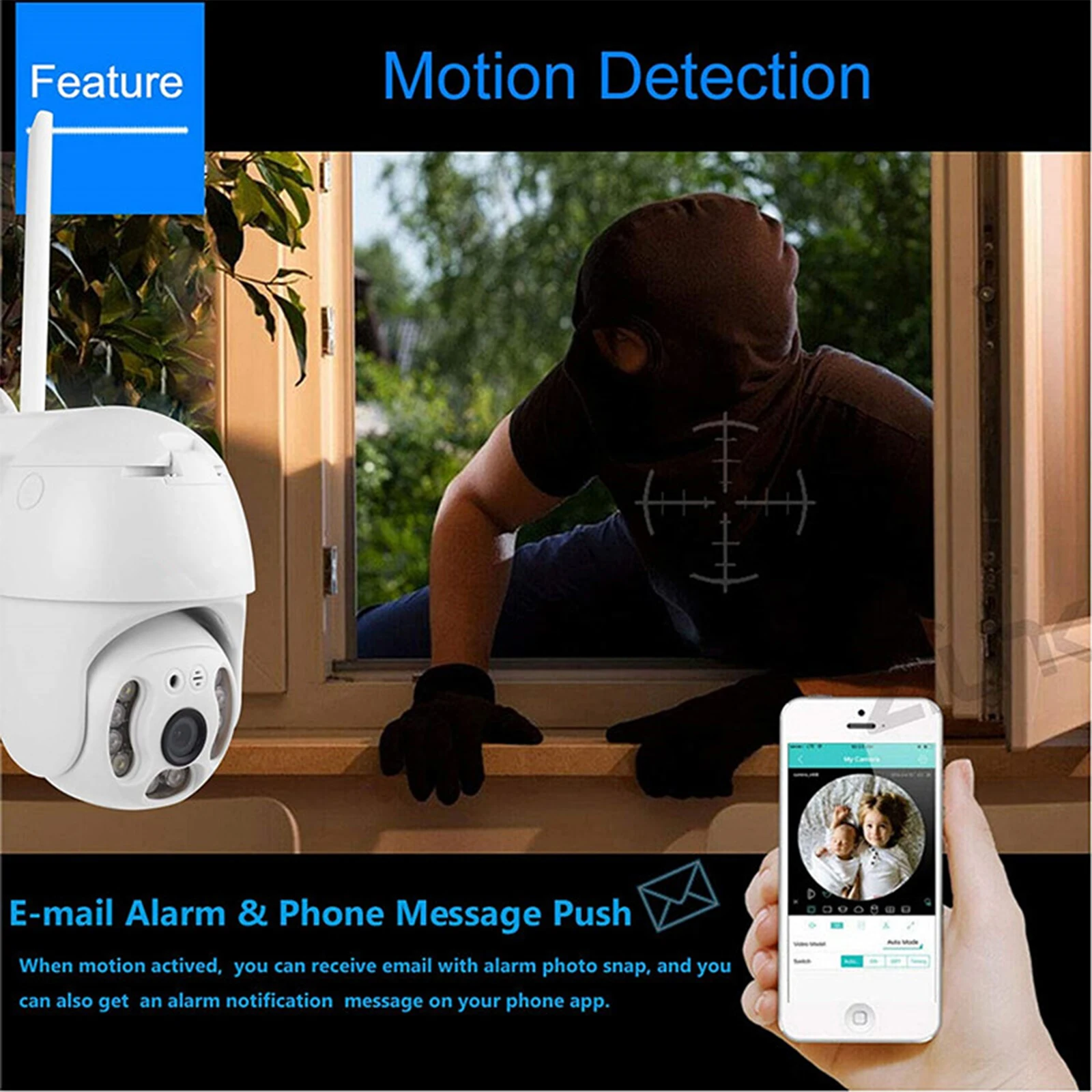 Чистое двустороннее аудио:В беспроводную камеру встроен микрофон и динамик. Эта камера домашней безопасности позволяет слушать и разговаривать со своей семьей, домашними животными в режиме реального времени. Когда вы заметили любого злоумышленника, вы можете отпугнуть его через приложение для телефона в любом месте в любое время