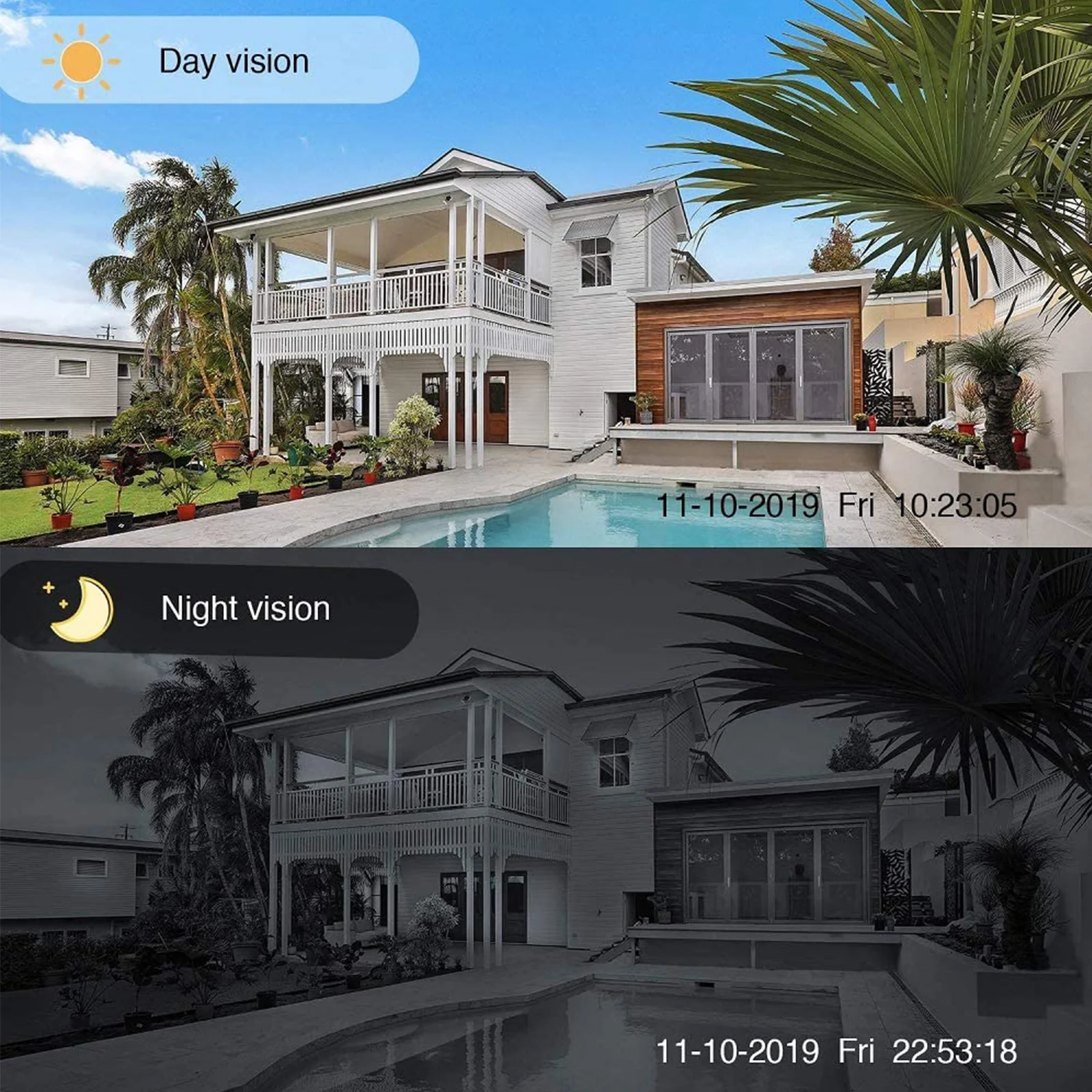 Умное ночное видение:Встроенные 6 ИК светодиодный одов и 4 белых светодиода, ночное видение до 50 м/164 фута. Когда камера безопасности обнаруживает движение ночью, загорается белый светодиодный, а ночное видение переходит из черно-белого ИК-режима в полноцветный режим, обеспечивает цветное видео