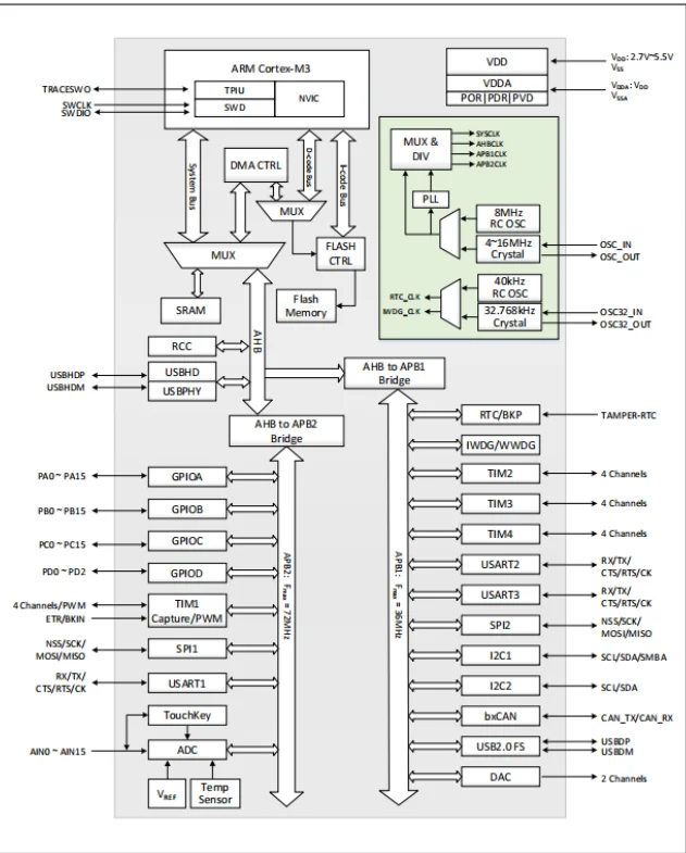 Модель: CH32F103C8T6.Ядро: ARM 32 Cortex-M3 CPU.Рабочая частота 72 МГц.64K флэш-память, 20K SRAM.2,0-3,6 В мощность, I/O.Сброс (POR/PDR).4-16 МГц кристалл.Бортовой мини USB интерфейс, вы можете дать Питание платы и USB связь.Размеры: 5,3 см x 2,2 см.Схема внутренней структуры продукта