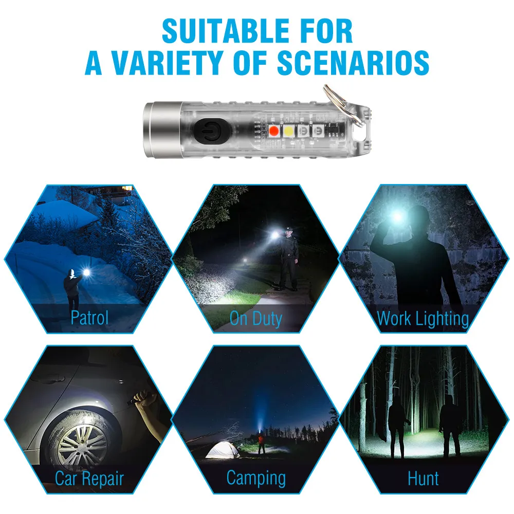 Оттенки разных цветов помогают обнаруживать вещи, которые невидимы невооруженным глазом. Фиолетовый светильник используется для идентификации валюты, водительских прав, официальных удостоверений личности, паспорта, нефрита, пятен и т. Д. Максимальная яркость составляет 400 лм, и он также может быть использован как флэш-светильник. Есть также белый светильник, белый светильник, мигающий, фиолетовый светильник, красный светильник, красный светильник, мигающий, красный и синий мигающий попеременно.